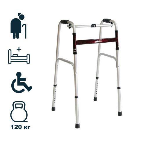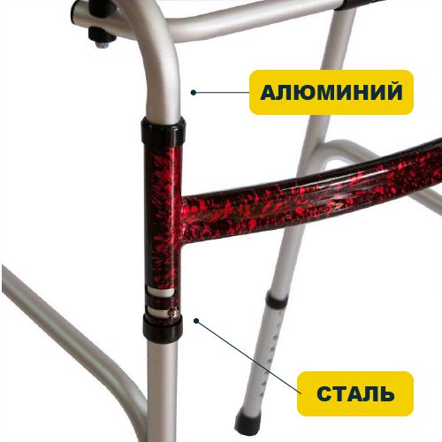 Опорные поручни ходунков выполнены из анодированного алюминия и не подвергаются коррозии, соединяющая рама – из стали с полимерным покрытием.