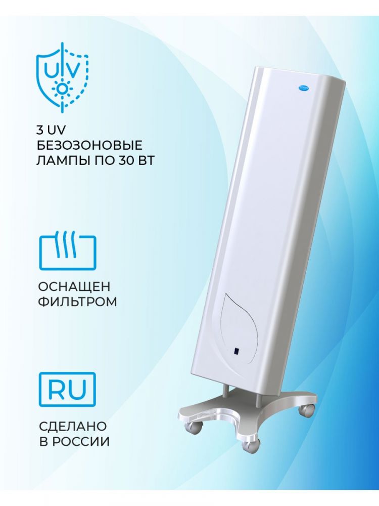 Рециркулятор МЕГИДЕЗ 3908.1 оснащен тремя бактерицидными УФ-лампами с общей мощность 90 Вт. Подходит для размещения в доме, квартире, офисе, в торговых помещениях и в помещениях медицинского назначения, кроме операционных и стерильных зон. Рассчитан на объем помещения до 100 м³. В периоды эпидемий и при большом скоплении людей, рекомендуем включать прибор на 3 часа и более.