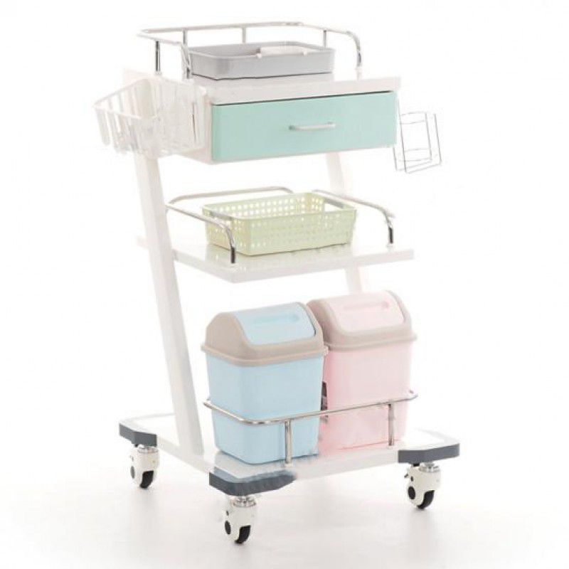 Тележка медицинская 16446 BLQ 021 - стол-тележка медицинская с тремя металлическими полками на металлокаркасе, выдвижным ящиком и навесными аксессуарами.