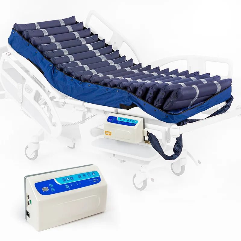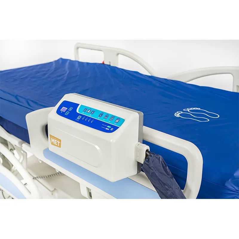 Противопролежневая система переменного давления MET AIR PRO-1000 разработана для лечения и профилактики пролежней средней тяжести, вызванных длительным постельным режимом. Матрас состоит из 18 воздушных камер индивидуально заполненных воздухом. Камеры поочередно надуваются и сдуваются при помощи компрессора, удерживая таким образом вес на определенных участках тела и позволяя кровотоку достигать различных участков тела обездвиженных или ослабленных пациентов.