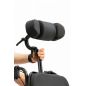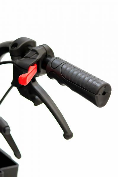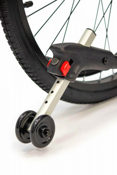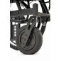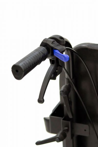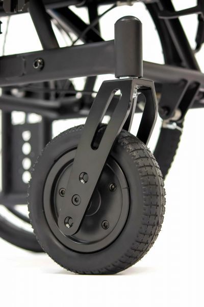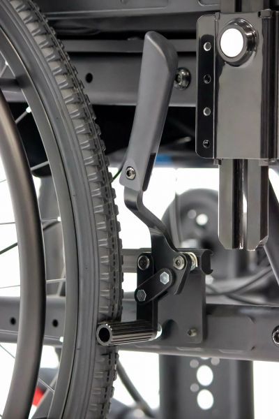 Пневматические колеса спереди и сзади смягчают дорожные удары, делая управление более легким и комфортным. Во время остановки коляска надежно фиксируется боковыми стояночными тормозами. На ручках для сопровождающего предусмотрено дополнительное управление тормозами. Модель имеет антиопрокидыватели для еще большей устойчивости.