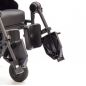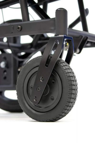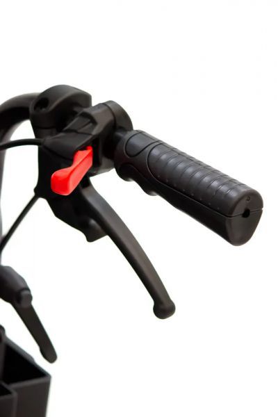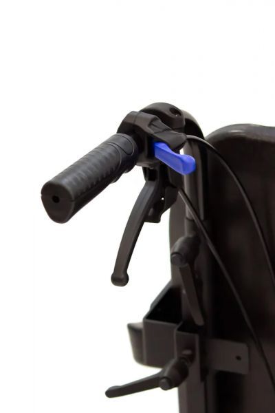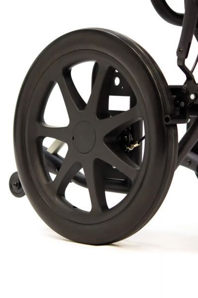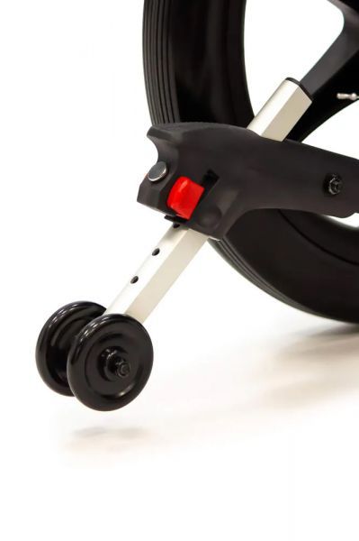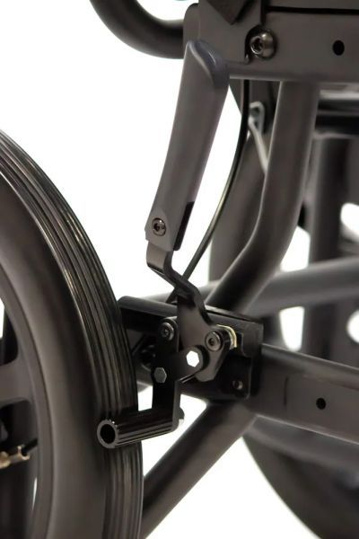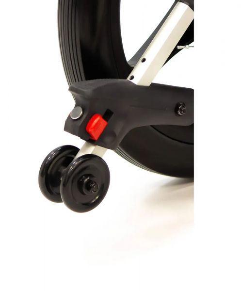 Надежные литые колеса сзади твердо держат дорогу, обеспечивая стабильность и грузовую прочность. Мягкие пневматические колеса спереди чутко сглаживают кочки и повороты, отвечая за комфорт и легкость управления. Во время остановки коляска надежно фиксируется боковыми стояночными тормозами. На ручках для сопровождающего предусмотрено дополнительное управление тормозами. Модель имеет антиопрокидыватели для еще большей устойчивости.
