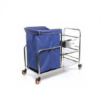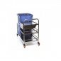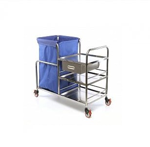 Многофункциональная сервисная тележка с тремя полками, оборудованными торцевыми ограждениями, а под верхней находится выдвижной ящик на шариковых телескопических направляющих с доводчиками. Высокий мягкий мешок-контейнер из крупнотканного полиэстера с резиновым накатом с изнаночной стороны, который можно снять с тележки, освободив высокое транспортировочное место. Технические свойства тележки обеспечивают многогранную сферу применения для этого сервисного устройства.