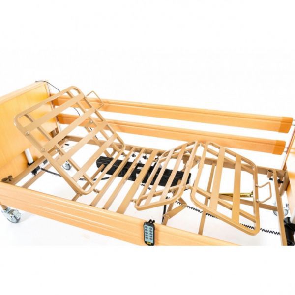Кровать детская медицинская функциональная 4-х секционная, с электрическим приводом для регулировки высоты, спинной и тазобедренной (ножной) секции и углов TR/ATR, с пультом управления. Главная особенность данной модели - она практически неотличима от простых домашних кроватей и имеет ортопедическое ложе из лёгких металлических ламелей в коричневой эмали, обеспечивающих оптимальное распределение веса и дополнительный ортопедический эффект.