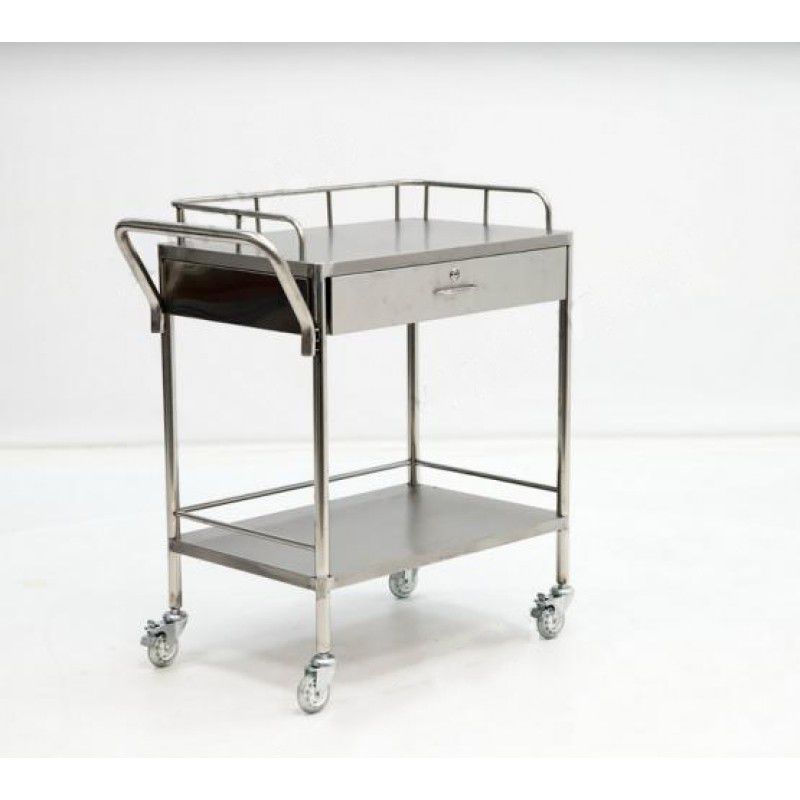 Тележка МЕТ ТN-100 (16042) BLQ 013 - манипуляционный столик из нержавеющей стали с выдвижным ящиком на телескопических направляющих, закрывающимся на замок, и двумя полками с трехсторонними сварными трубчатыми ограждениями. Выполненный целиком из нержавеющей стали, столик для врачебных манипуляций обеспечивает удобную дезинфекцию при максимально длительном сроке службы.