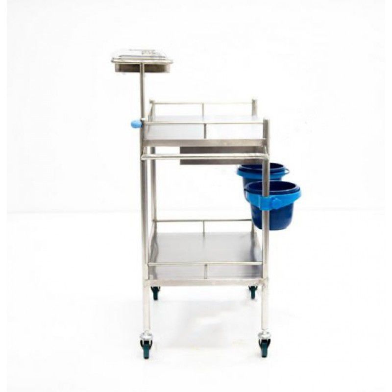 Тележка МЕТ ТN-150 (15660) BLQ 013 манипуляционная из нержавеющей стали - манипуляционный столик из нержавеющей стали с двумя полками, поворотным лотком, 2 ведерками на поворотных кронштейнах и выдвижным ящиком под верхней полкой. Манипуляционный столик с трёхсторонними ограждениями для высоких ёмкостей. Высокоуглеродистая нержавейка, из которой выполнен столик МЕТ ТN, является лучшим на сегодняшний день и неоднократно проверенным оптимальным материалом для медицинских учреждений.