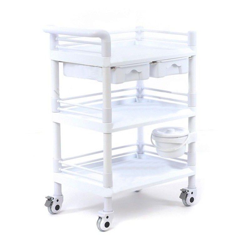 Стол манипуляционный трёхполочный, сделанный целиком из белого пластика, с трёхсторонними боковыми ограждениями на полках.