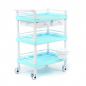 Стол манипуляционный с тремя полочками, сделанный целиком из пластика, с трёхсторонними боковыми ограждениями на полках. Два выдвижных ящика на шариковых направляющих полного выдвижения. Четырёхсторонние выпрессованные отбортовки на всех полках. Высокие трёхсторонние ограждения для транспортировки высоких предметов.