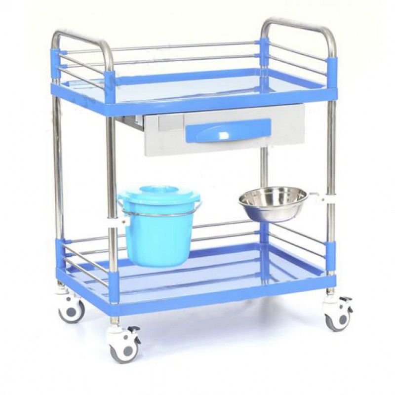Тележка медицинская МЕТ ТP-300 (15954) BLQ 021 - стол манипуляционный с двумя полками, верхняя с выдвижным ящиком и мусорным ведром. На кольцеобразных кронштейнах установлены стальной таз для отходов и мусорное ведро.