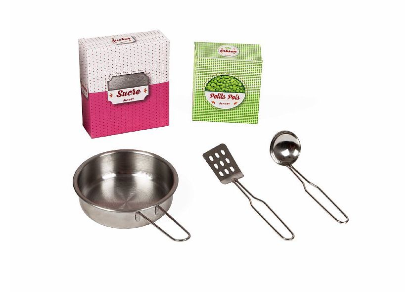 В комплекте часы, подвес для аксессуаров, две металлических лопатки, сковородка, металлическая мойка с краном, две вращающихся кнопки со звуковыми эффектами, 2 картонных коробки с имитацией еды.