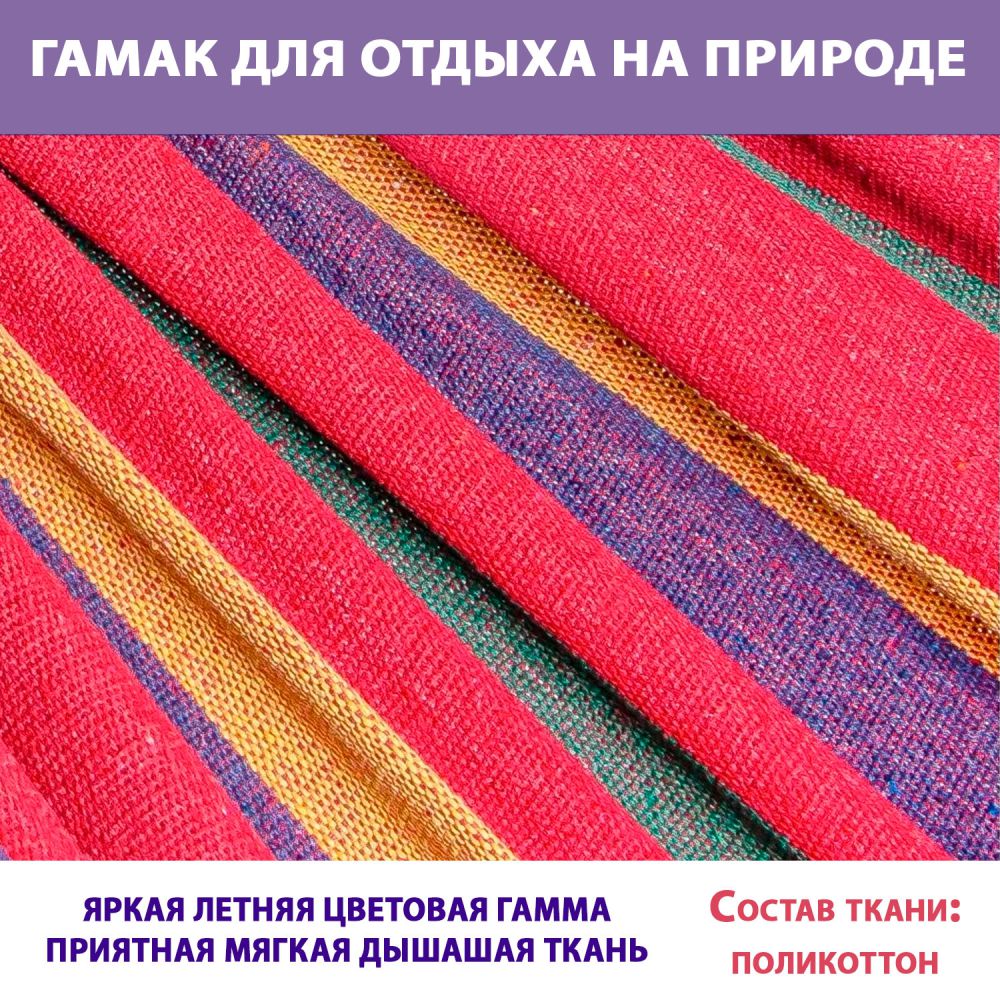 Универсальная полосатая расцветка создает позитивное настроение. Легкий удобный гамак заменит в походе кровать и станет комфортным спальным местом. В сложенном виде гамак занимает мало места, складывается в специальный чехол, удобен при переноске в походной сумке или рюкзаке.