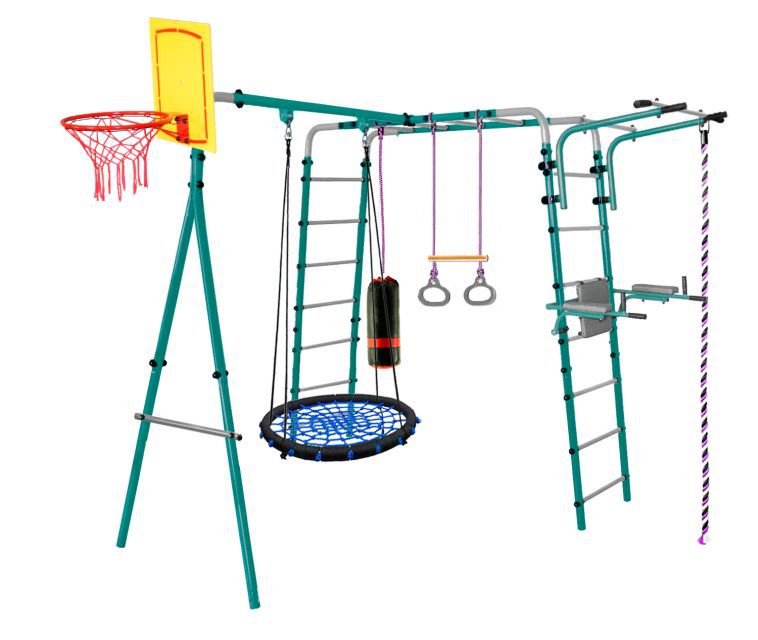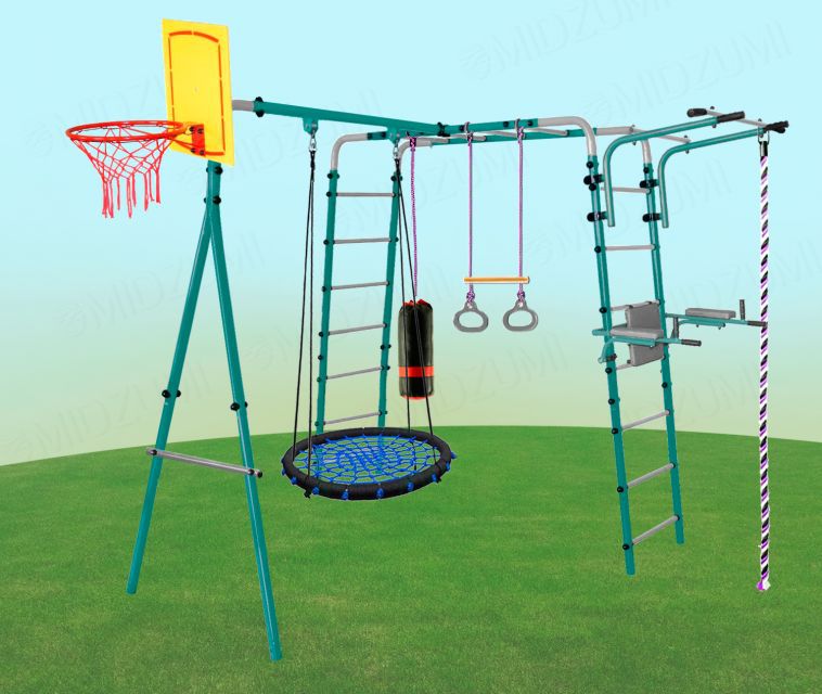 Уличный Детский спортивный комплекс Midzumi Hanabi Large XL в новом цветовом решении - морской бриз. Этот спортивный комплекс показывает разнообразие модельного ряда продукции Midzumi. Прочная металлическая конструкция позволяет выдерживать до 100 кг. Крепление Комплекса осуществляется с помощью бетонирования. Midzumi Hanabi Large XL состоит из каркаса двух металлических лестниц с рукоходом, передвижного турника, навесных качелей-гнезда, каната и колец с перекладиной, баскетбольного щита, брусьев откидных со спинкой и детской боксерской грушей. Качественные материалы изготовления надолго сохраняют яркость цвета и рассчитаны на любые погодные условия, устойчивы к попаданию прямых солнечных лучей, морозу, дождю и перепадам температур, прослужат долго даже при самом интенсивном использовании.