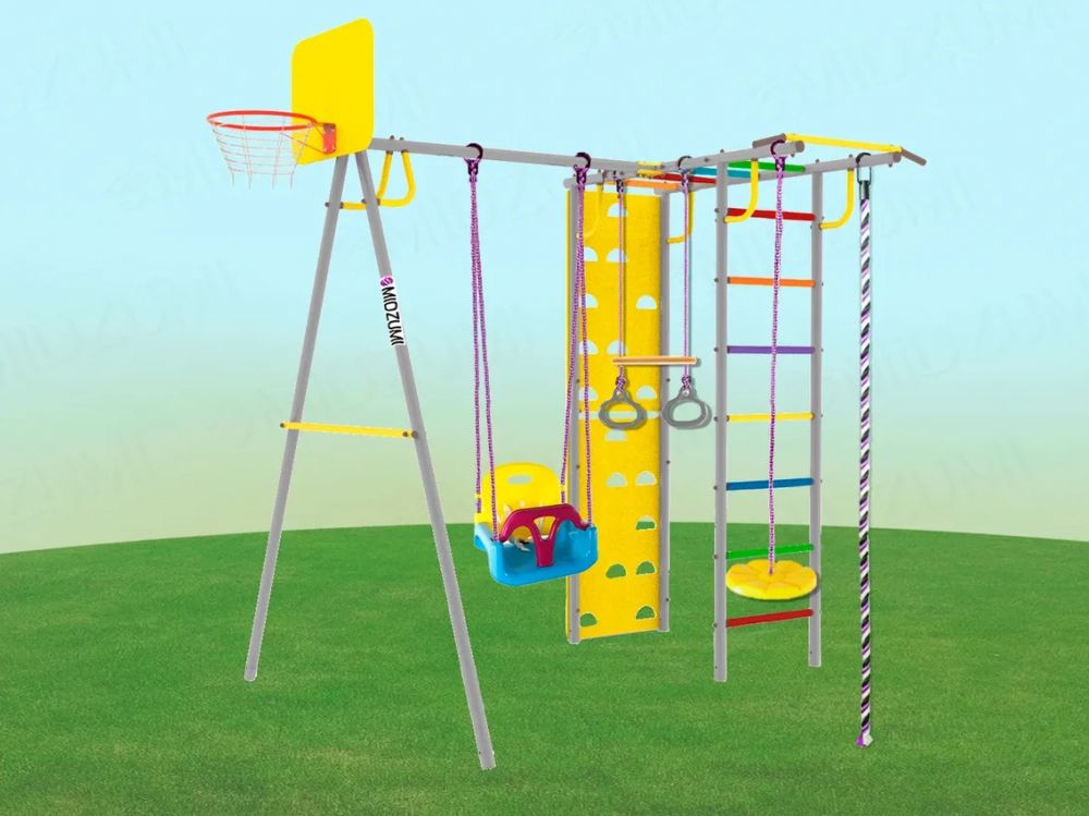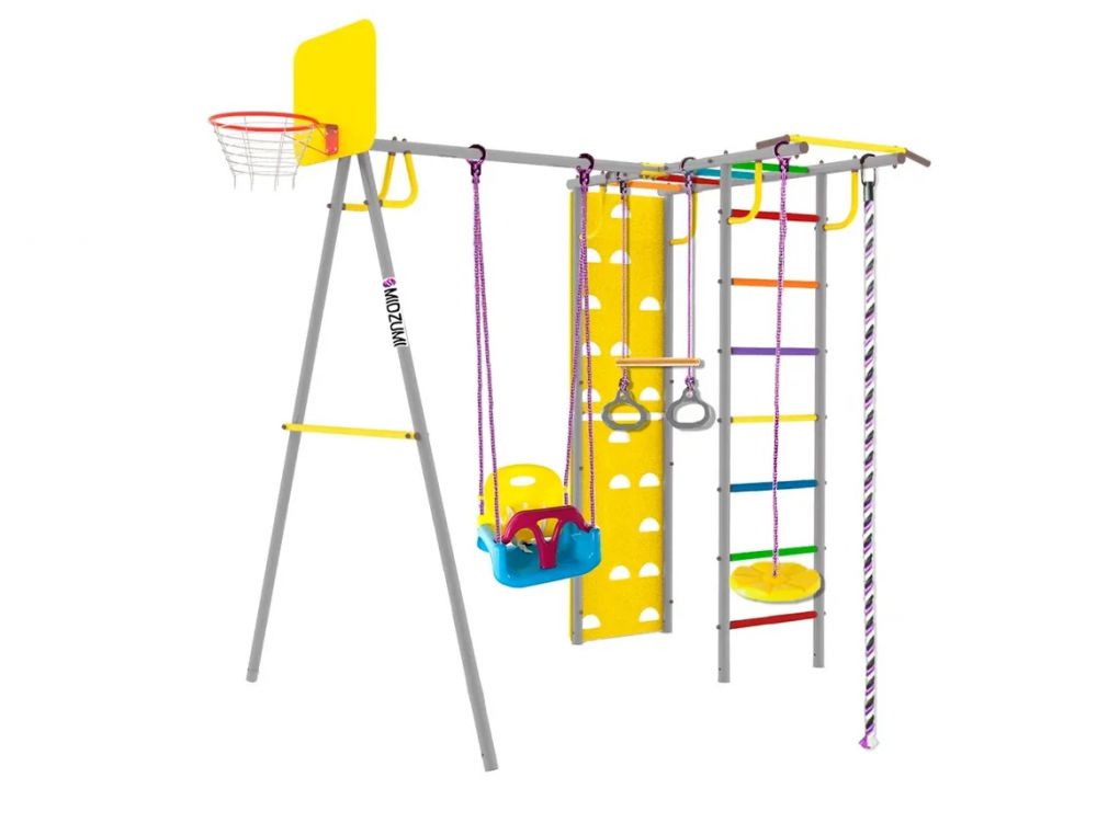 Уличный Детский спортивный комплекс Midzumi Rainbow Small в цветовом решении - туманное утро. Этот спортивный комплекс показывает разнообразие модельного ряда продукции Midzumi. Прочная металлическая конструкция позволяет выдерживать до 100 кг. Крепление Комплекса осуществляется с помощью бетонирования оснований. Midzumi Rainbow Small состоит из А-образного опоры из двух металлических стоек с перекладиной для навесного оборудования и каркаса из шведской стенки с рукоходом, скалодрома, передвижного турника, навесных пластиковых качелей, лианы, каната, колец с перекладиной и баскетбольного щита. Качественные материалы изготовления надолго сохраняют яркость цвета и рассчитаны на любые погодные условия, устойчивы к попаданию прямых солнечных лучей, морозу, дождю и перепадам температур, прослужат долго даже при самом интенсивном использовании.