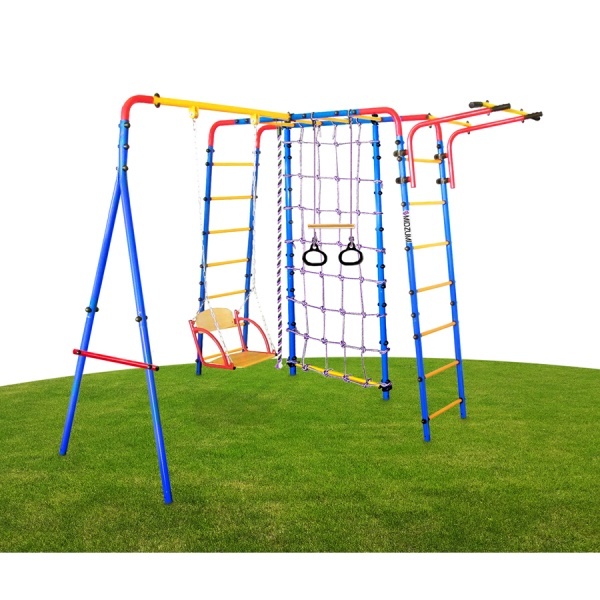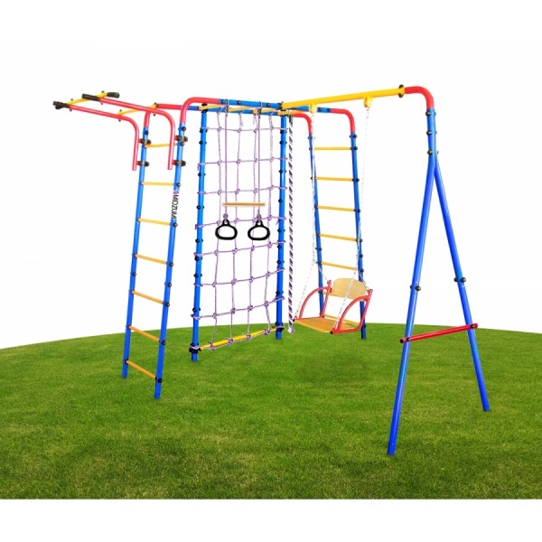 Многофункциональный комплекс Midzumi Suteki создает безопасные и удобные условия для активного отдыха и регулярных занятий спортом. Модель предназначена для уличного монтажа и рассчитана на детей разного возраста. Конструкция включает в себя две части. Первая состоит из металлического каркаса с качелями, а вторая предусматривается наличие двух металлических лестниц, которые соединены рукоходом, а на одной из лестниц закреплен канатный лаз. Помимо имеющейся комплектации можно добавить в спортивный комплекс канат и кольца гимнастические. Металлическая конструкция выдерживает вес до 100 кг. Качели подвешиваются на цепях, что обеспечивает высокий уровень безопасности. Монтаж детского комплекса происходит по технологии бетонирования опор. С помощью спортивного комплекса дети могут развивать силу и ловкость, тренировать выносливость, укреплять свое здоровье, приобщаться к спорту и активному образу жизни!