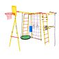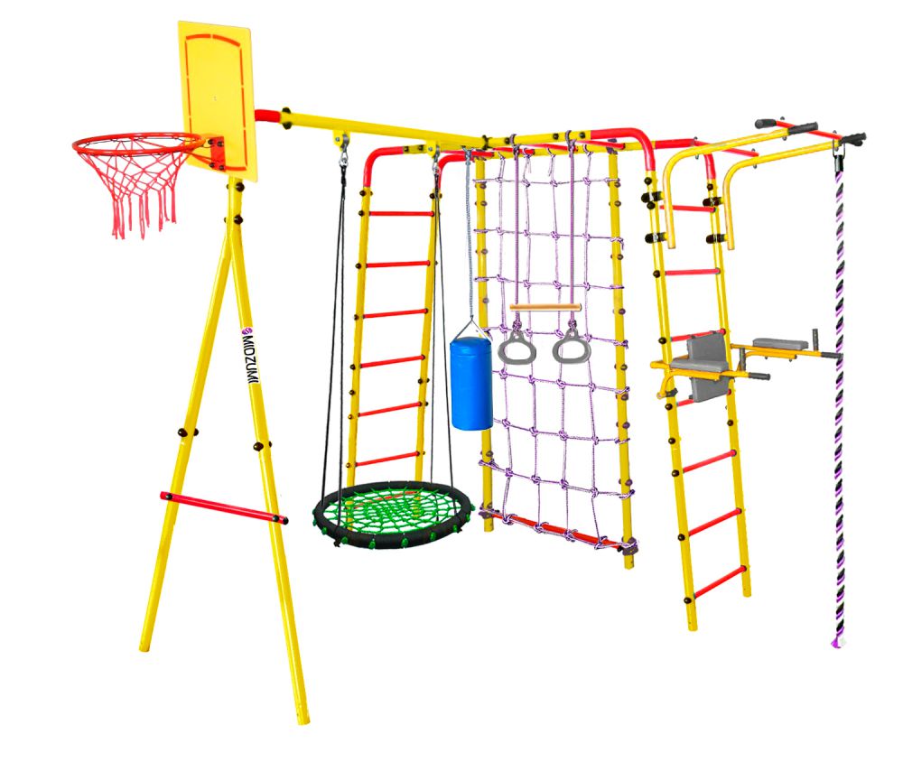 Уличный спортивно-игровой комплекс Midzumi Tamayo Large L в новом цветовом решении - солнечный день. Прочная металлическая конструкция позволяет выдерживать до 100 кг. Крепление комплекса осуществляется с помощью бетонирования. Брусья со спинкой рассчитаны для тренировки многих групп мышц и помогут Вам укрепить спину и руки, накачать пресс, подкачать ноги. Удобная конструкция креплений позволяет регулировать необходимую Вам высоту и складывать брусья после тренировки, компактно размещая их рядом с опорами комплекса. Детский боксерский мешок-груша создан для детей, которые хотят научиться боксерским приемам - его можно подвесить на удобной высоте на горизонтальную перекладину или турник. Это облегченный вариант классических боксерского мешка с наполнителем поролон, наиболее безопасный для детей, а также удобный и компактный в переноске и хранении. Баскетбольный щит с диаметром кольца 34 см. Упражнения с мячом способствуют развитию базовых навыков игры в баскетболе, прекрасно тренируют мышцы рук, увеличивая ловкость и внимание, занимают и одновременно физически развивают ребенка. Щит необычайно прочен, обеспечивает длительное и качественное использование. Канатный лаз - это прочная сетка из крепкого шнура, значительно расширяет игровое пространство детского комплекса и позволяет разнообразить функциональность уличного спортивного комплекса. Удобные и надежные качели-гнездо. Вместительный размер круглого сидения качелей-гнездо (диаметр 80 см снаружи и 73 см внутри)и прочные тросы качелей диаметром 10-16 мм позволяют с удовольствием качаться на них, как детям, так и взрослым. Конструкция креплений тросов позволяет увеличивать длину до 170 см, уменьшая высоту сидения до 40 см от пола, настроить высоту под рост удобный ребенку. Качественные материалы изготовления надолго сохраняют яркость цвета и рассчитаны на любые погодные условия, устойчивы к попаданию прямых солнечных лучей, морозу, дождю и перепадам температур, прослужат долго даже при самом интенсивном использовании.