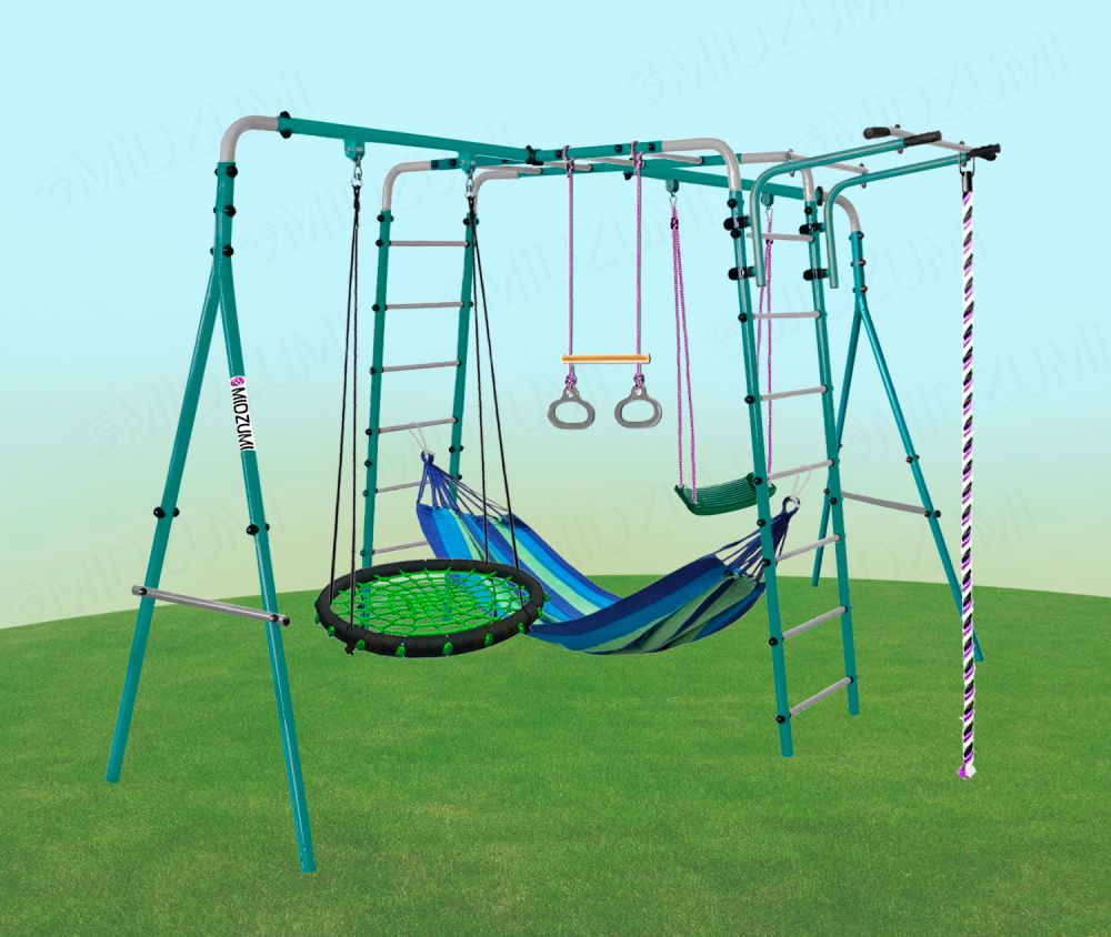 Детский спортивно-игровой комплекс Midzumi Tenshi Umi Large L в новом цветовом решении - морской бриз. Прочная металлическая конструкция позволяет выдерживать до 100 кг. Крепление комплекса осуществляется с помощью бетонирования.