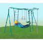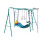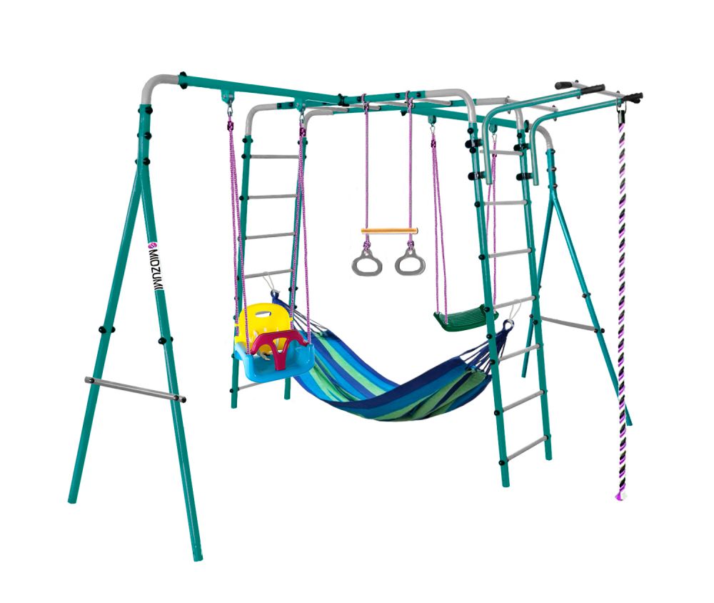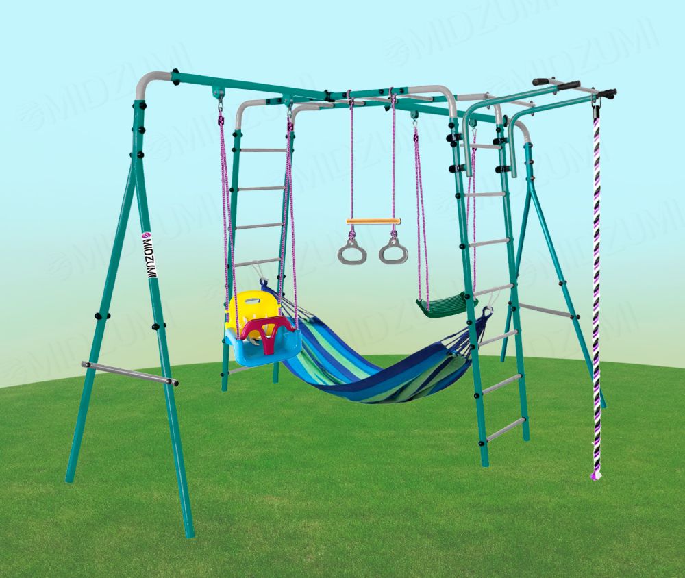 Детский спортивный комплекс Midzumi Tenshi Umi Small состоит из каркаса двух металлических лестниц с рукоходом, передвижного турника, пластиковых качелей, качелей 3в1, подвесного гамака, каната и колец с перекладиной. Прочная металлическая конструкция позволяет выдерживать до 100 кг. Крепление комплекса осуществляется с помощью бетонирования.