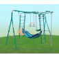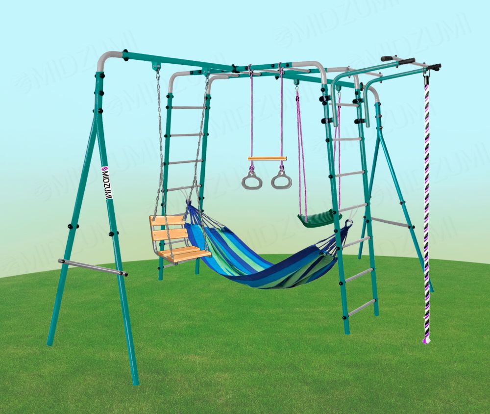 Уличный детский спортивный комплекс Midzumi Tenshi Universal в новом цветовом решении - морской бриз. Tenshi Universal состоит из каркаса двух металлических лестниц с рукоходом, передвижного турника, пластиковых качелей без спинки, цепных качелей со спинкой, подвесного гамака, каната и колец с перекладиной. Прочная металлическая конструкция позволяет выдерживать до 100 кг. Крепление комплекса осуществляется с помощью бетонирования.