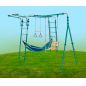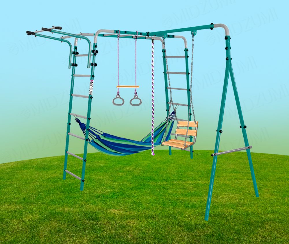 Детский спортивный комплекс Midzumi Yokina Ko Umi Universal состоит из каркаса двух металлических лестниц с рукоходом, передвижного турника, навесных цепных качелей, подвесного гамака, каната и колец с перекладиной. Прочная металлическая конструкция позволяет выдерживать до 100 кг. Крепление комплекса осуществляется с помощью бетонирования.