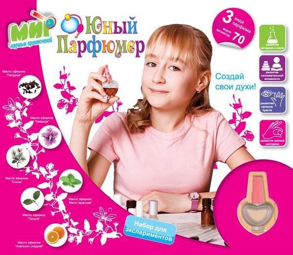 Девочка собственными руками сможет создать масляные духи, туалетную воду, дезодорант или твёрдые духи. Комплект позволяет вволю экспериментировать, создавая по-настоящему уникальные запахи и индивидуальные купажи.