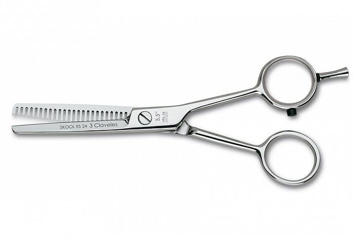 Ножницы парикмахерские филировочные Skool ES 12758 от испанского бренда 3Claveles – превосходный инструмент, который подойдёт как для новичка, так и для опытного мастера. Инструмент оснащен одной филировочной кромкой с 24 зубцами. Идеально подходит для создания структур и плавных незаметных переходов в стрижке.