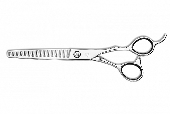 Ножницы филировочные Space T52070 оснащены регулируемым винтом с системой Soft-System который обеспечивает высокую точность и максимальную плавность хода полотен. Срезают до 15% волос из пряди. Инструмент изготовлен из высококачественной японской стали VG10. Эргономичная форма, литой упор, вогнутые полотна, внушительный размер и филировочная кромка с 46 зубцами.