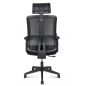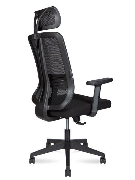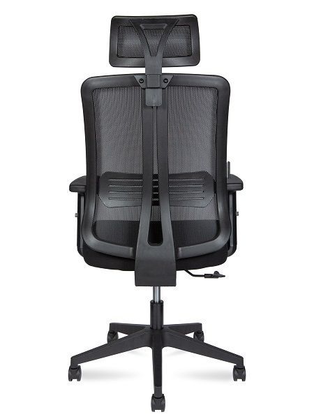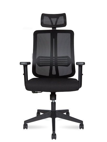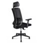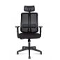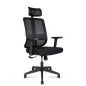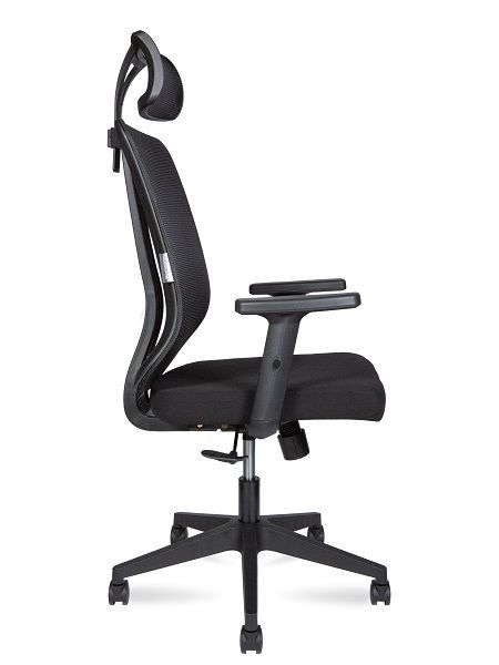 Офисное кресло с высокой спинкой, регулируемым по высоте подголовником. Спинка сетка, сиденье формованное ПУ. Оснащено механизмом качания Топ Ган с фиксацией в одном положении.