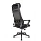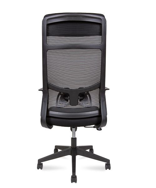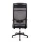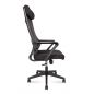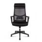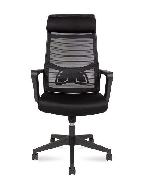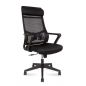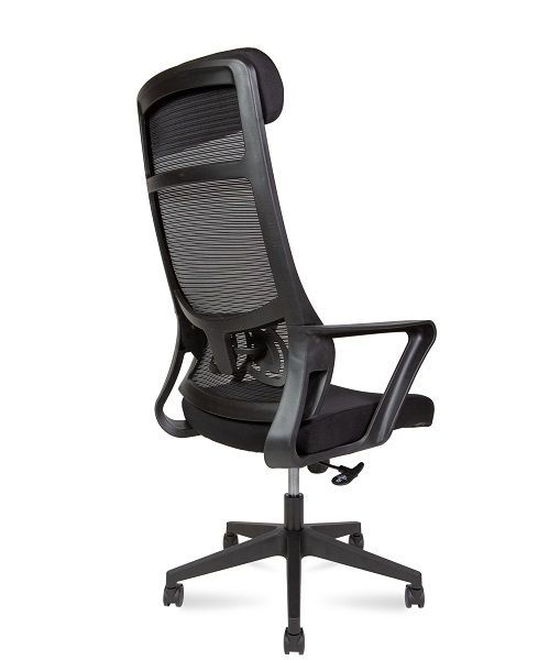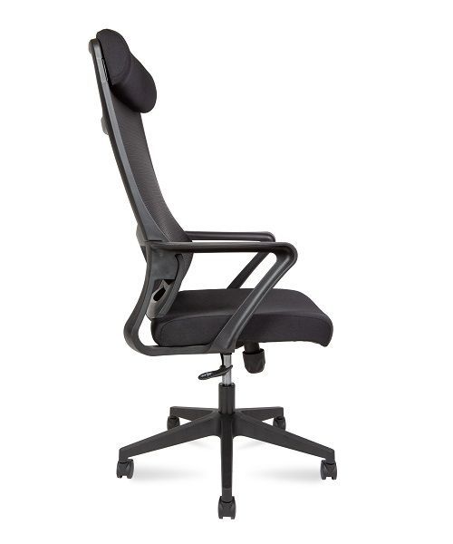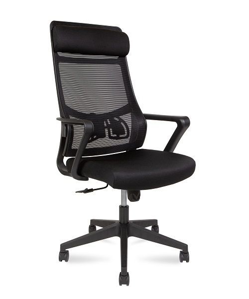 Офисное кресло с высокой спинкой и регулируемым по высоте подголовником. Спинка из армированной сетки, сиденье тканевое, формованное PPU. Фиксированный пластиковый подлокотник. Механизмом качания Топ Ган с фиксацией в рабочем положении. Крестовина пятилучевая пластиковая, нейлоновые ролики.