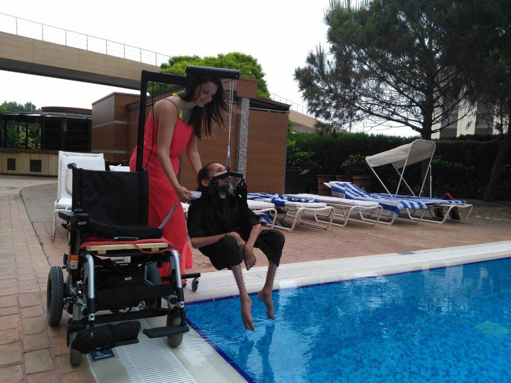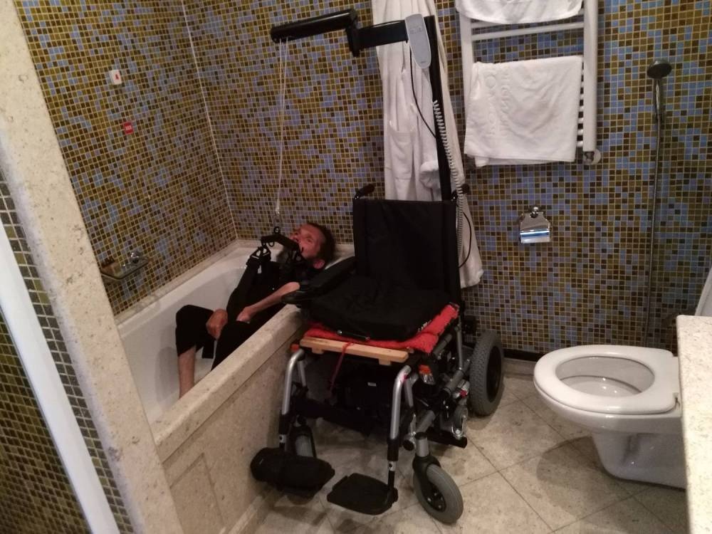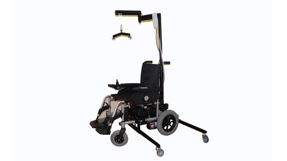 Инвалидное кресло-коляска с электроприводом Meyra Clou 9.500, оснащённое подъёмным устройством для пересаживания – реабилитационной лебёдкой Savva. Это электрическое устройство позволяет переместить больного человека в ванну, на туалет, на кровать, поднять с уровня пола, и в некоторых случаях даже опустить в бассейн или посадить в автомобиль.