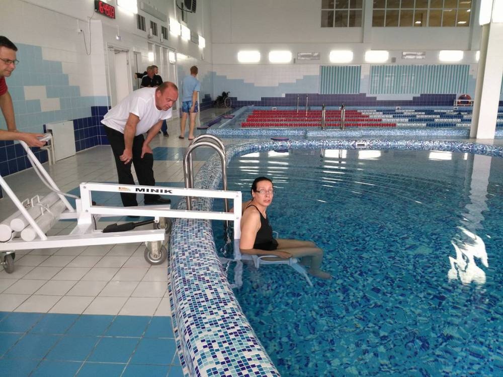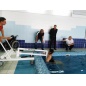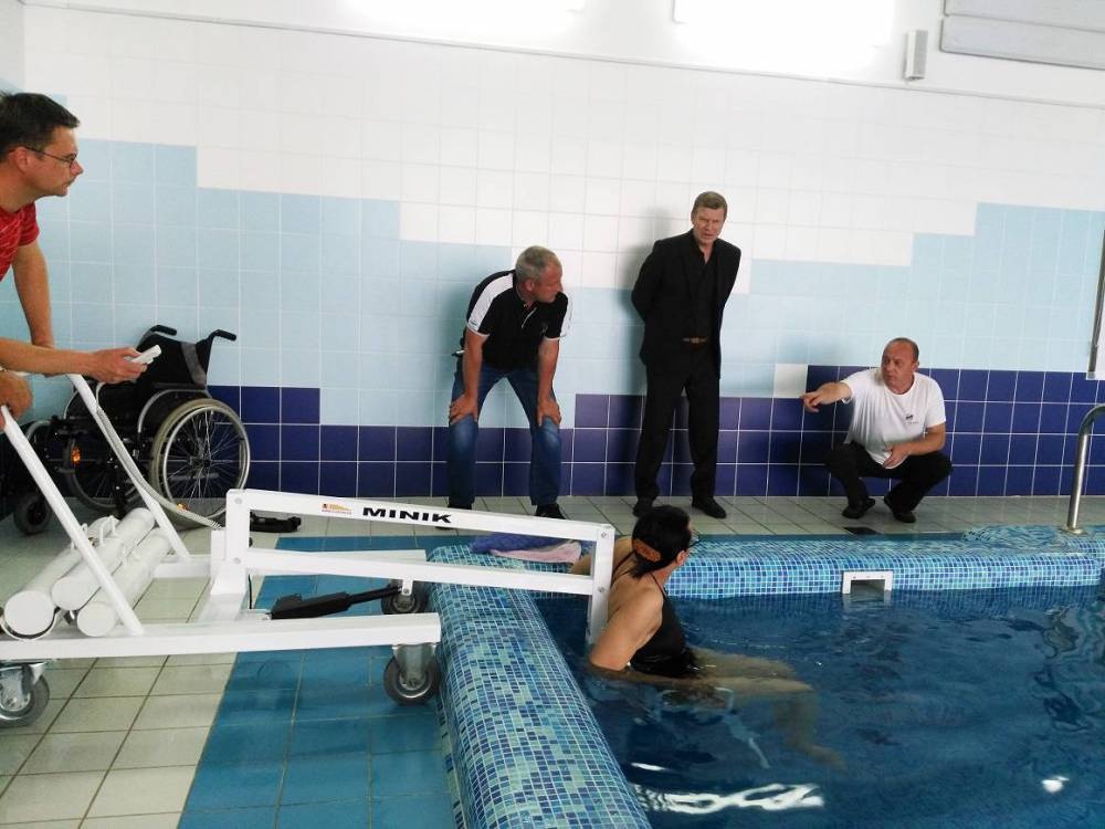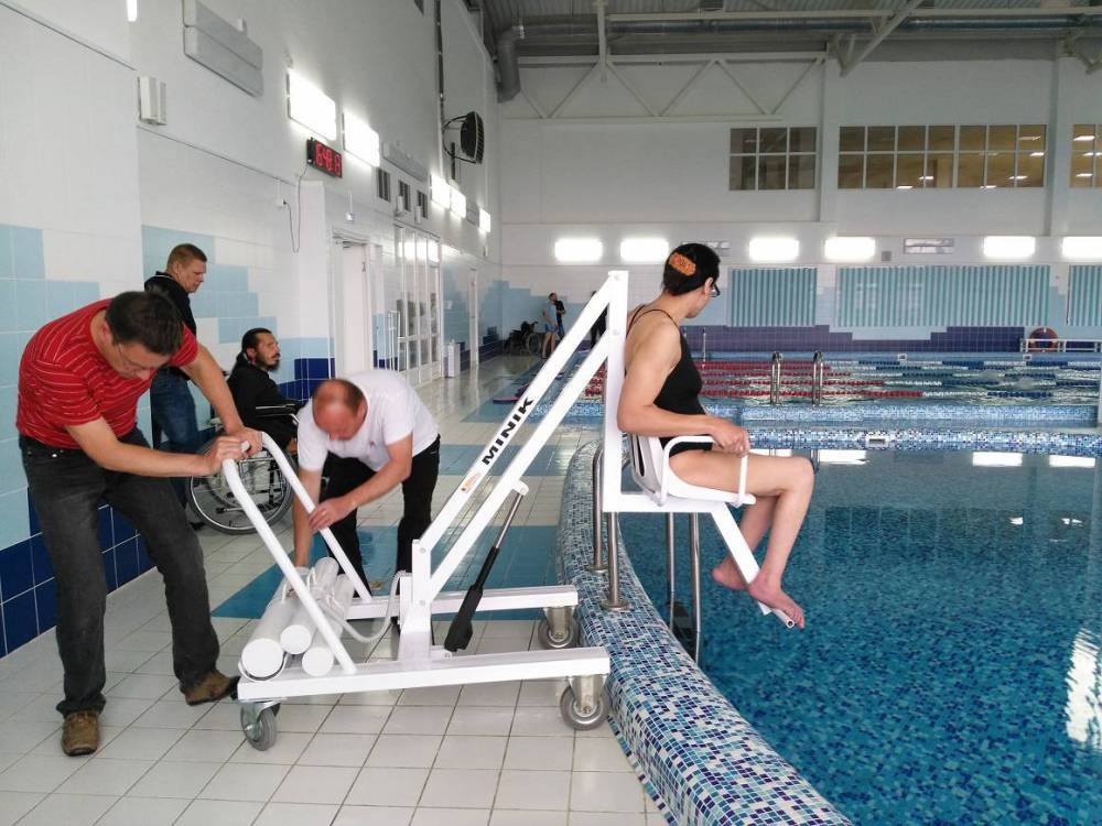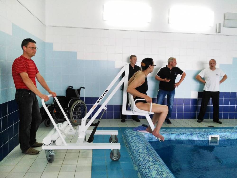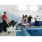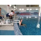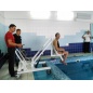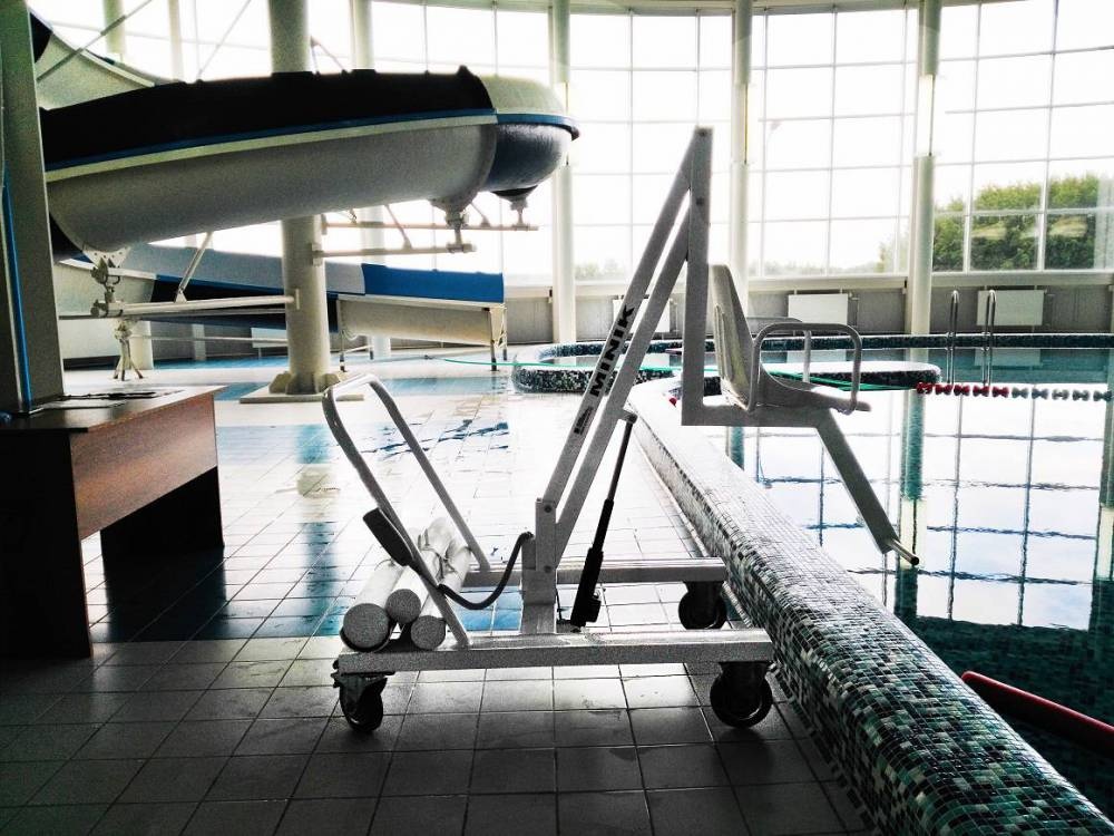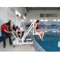 Мобильный подъёмник с противовесом для перемещения инвалидов и лиц пожилого возраста в бассейн. Оборудование оснащено низковольтным электроприводом, не требует монтажа, отличается манёвренностью и простотой управления. Опускает в воду через парапет на глубину 60 см. Автономный блок питания рассчитан на 30 спусков и поднятий.