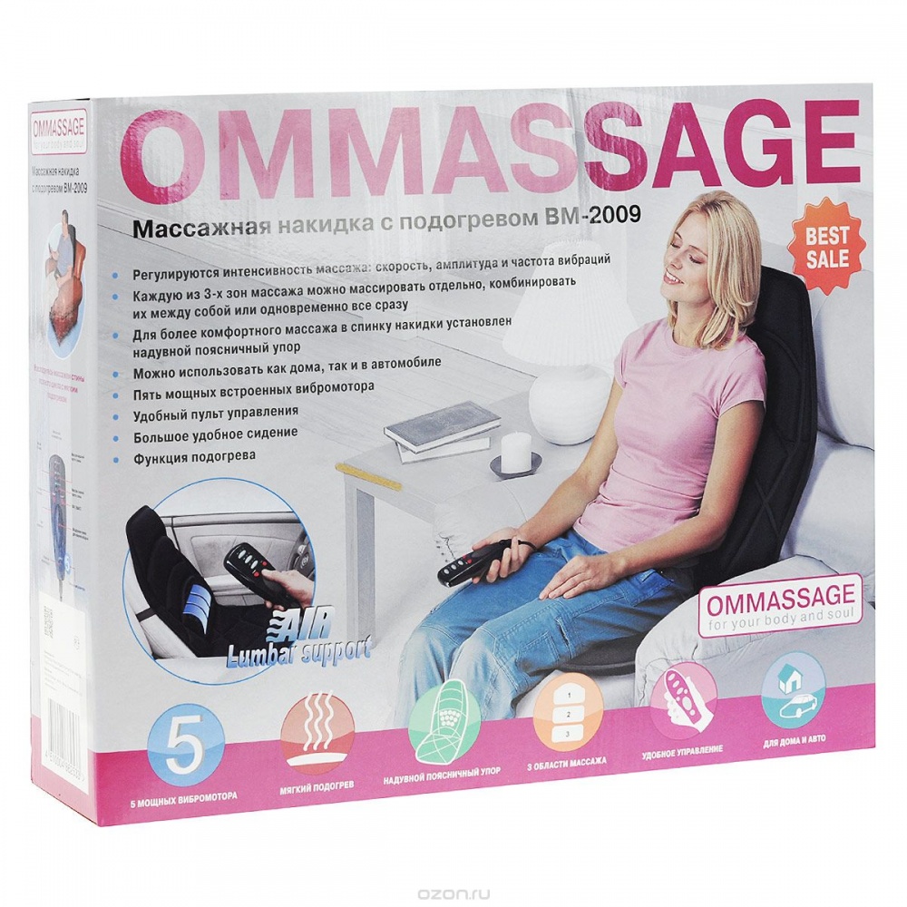 Поддержать свой организм в тонусе, избавиться от стресса и усталости поможет массажная накидка Ommassage BM-2009. Мощность и высокую эффективность работы обеспечивают пять электрических моторов. Накидка разделена на три зоны, интенсивность массажа для каждой можно регулировать самостоятельно. Массажная процедура может проводиться для шеи, плеч, спины, ягодиц и бедер. Благодаря уникальной системе крепления, массажная накидка прочно и надежно фиксируется на любом кресле или стуле. Если вы хотите использовать её в автомобиле, то устройство подключается к прикуривателю. Управление работой устройства осуществляется с помощью небольшого и удобного пульта.