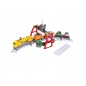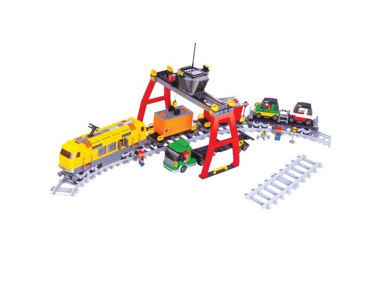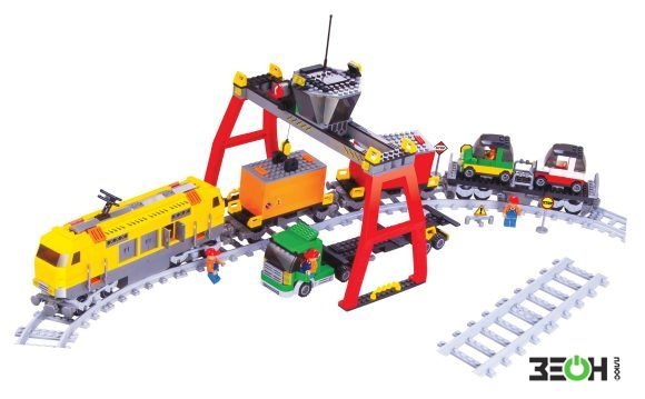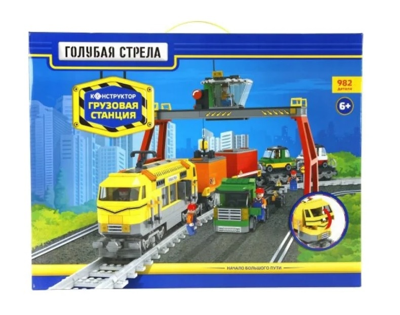 Торговая марка Голубая стрела представляет конструктор с железной дорогой и грузовой станцией. Локомотив и вагоны необходимо самостоятельно собрать из деталей конструктора. В комплекте можно найти 982 детали для постройки ж/д пути; подъемный кран, который будет нагружать товарный поезд, а также фигурки работников станции и дорожные знаки.