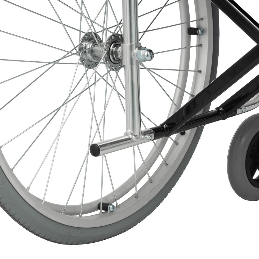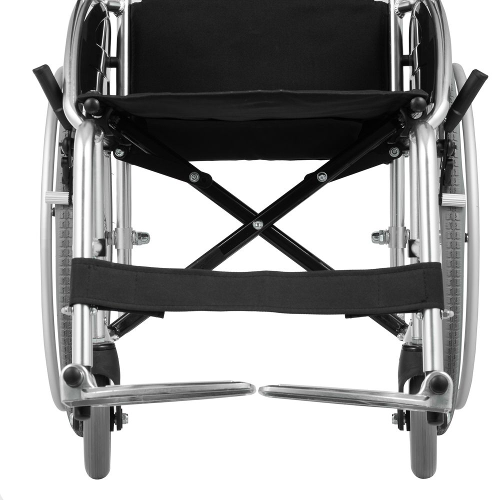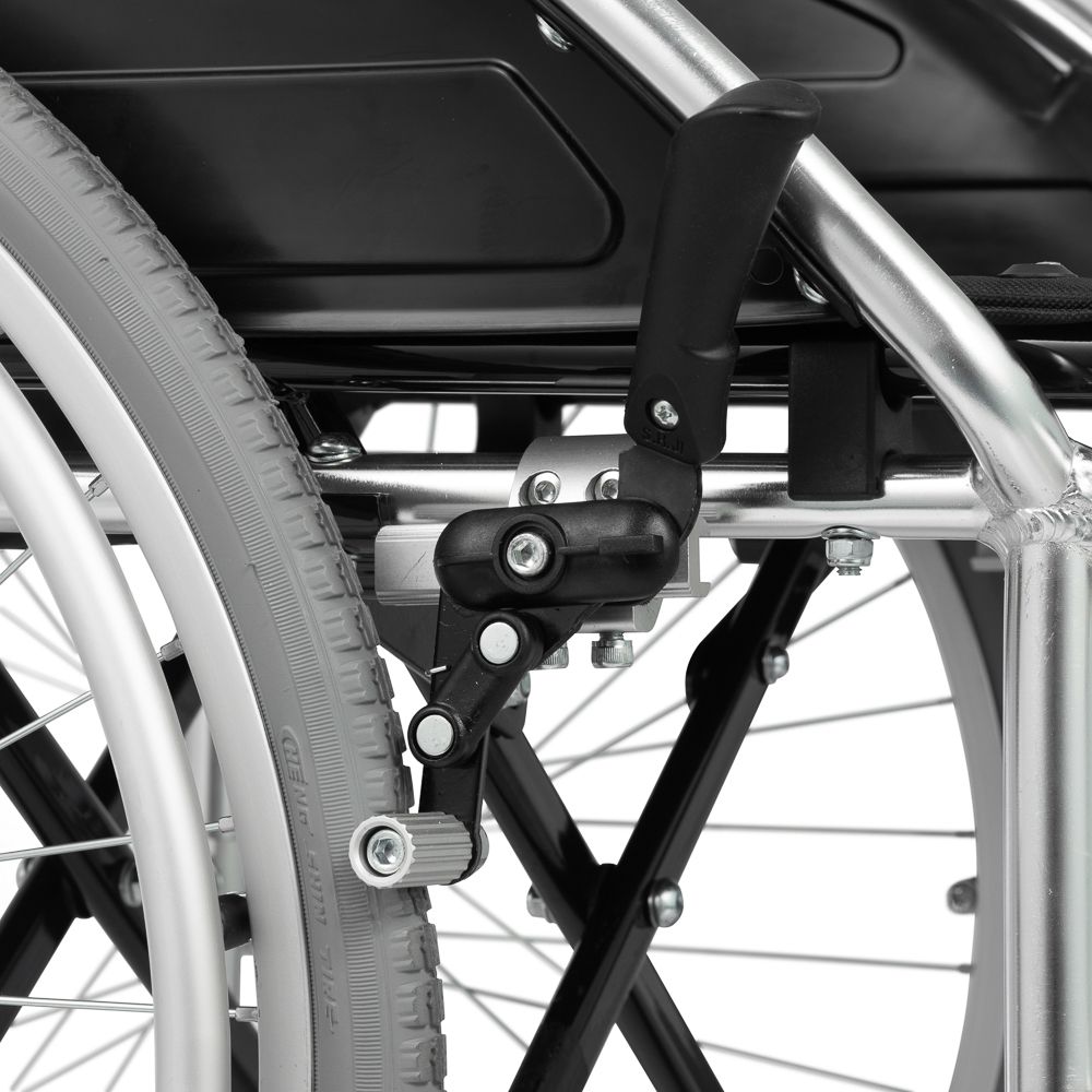 Кресло оснащено подлокотниками, боковыми ограждениями. Имеет стояночный тормоз задних колес. Откидные подножки имеют механическую регулировку высоты. Рама складывается по вертикали. На задней стороне спинки кресла имеется вместительный карман. Предусмотрена текстильная лента для упора голеней.