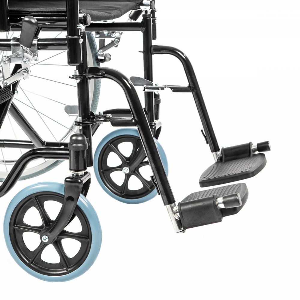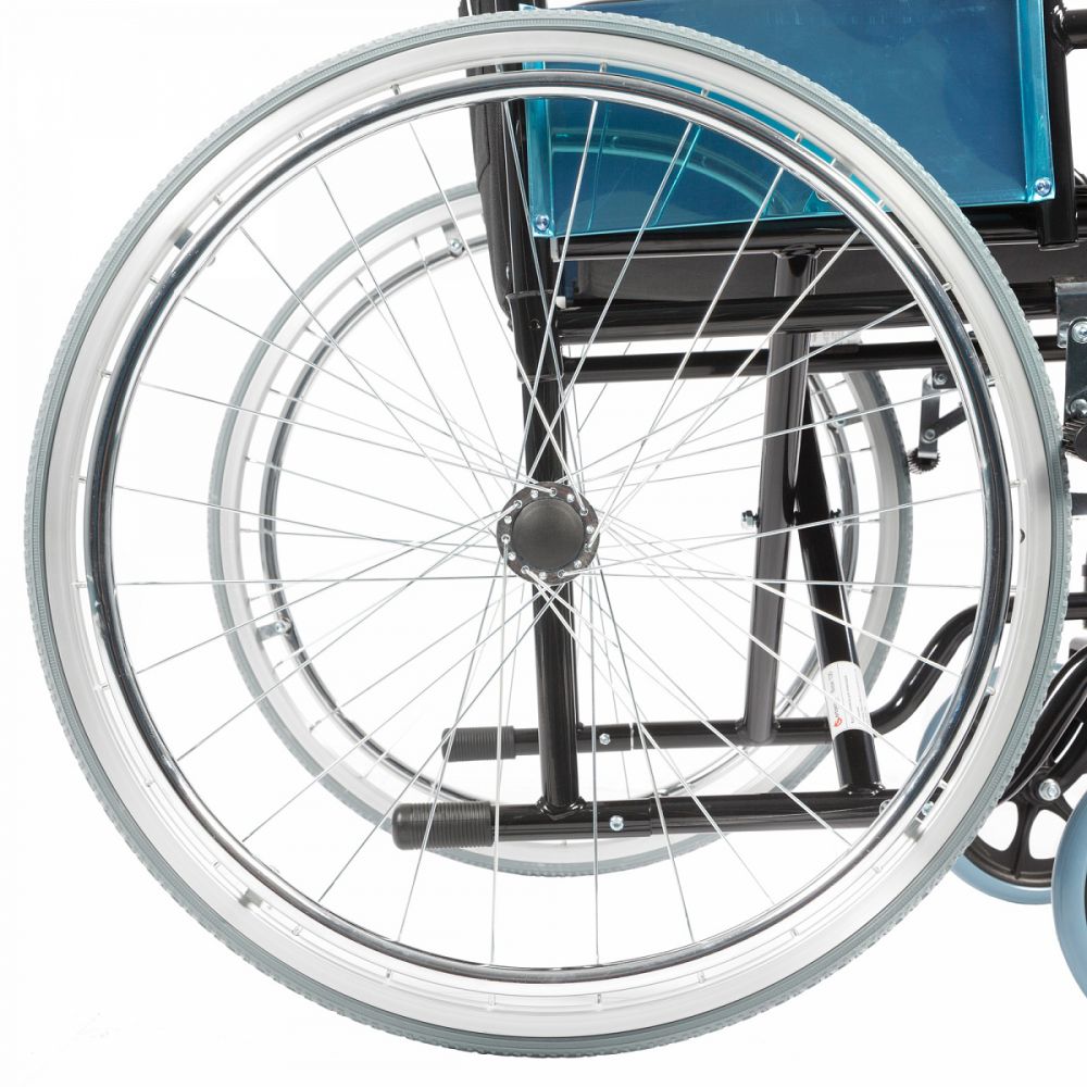 Ortonica Base 130 UU – инвалидное кресло универсального типа, которое может использоваться для передвижения пациента по квартире или для прогулок на улице. Конструкция складывается по вертикальной оси, что обеспечивает удобное хранение и транспортировку. Рама стальная, выдерживает большие нагрузки. Подлокотники легко снимаются, но не регулируются по высоте. Основные колеса оснащены хромированными ободами. Они смотрятся современно, но не очень практичные из-за гладкой поверхности. Рельефная поверхность обеспечила бы более удобный хват.