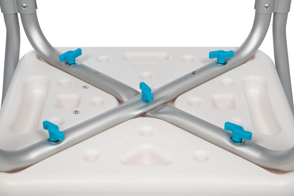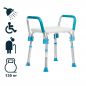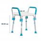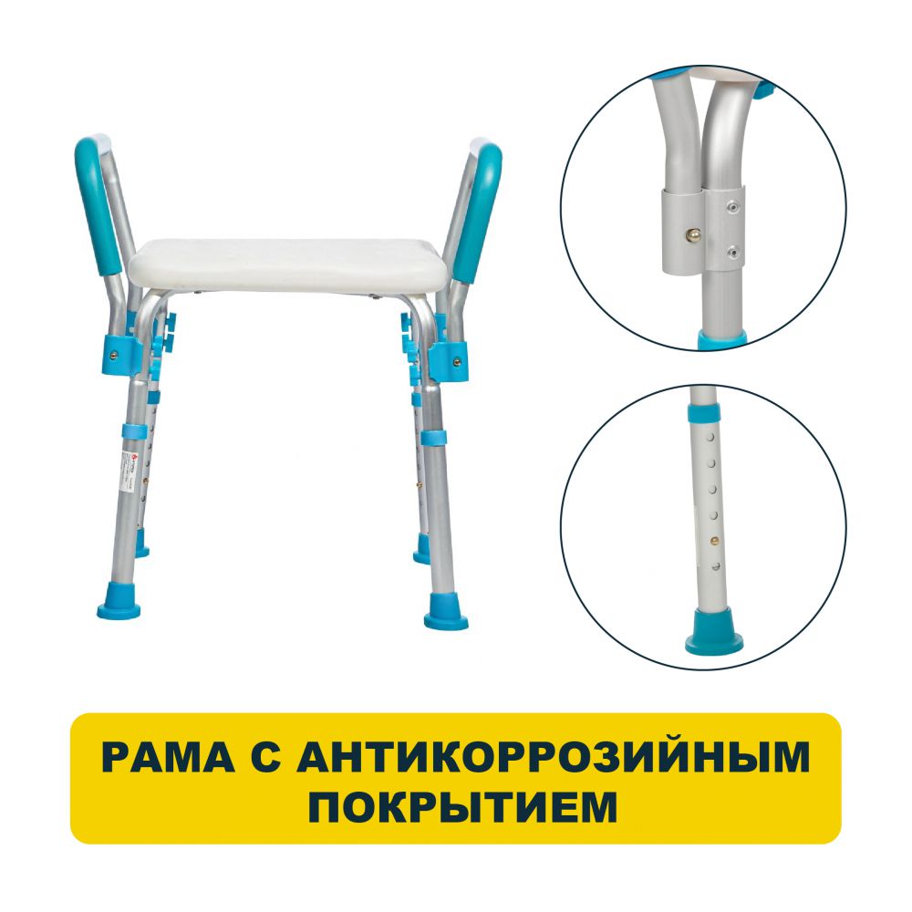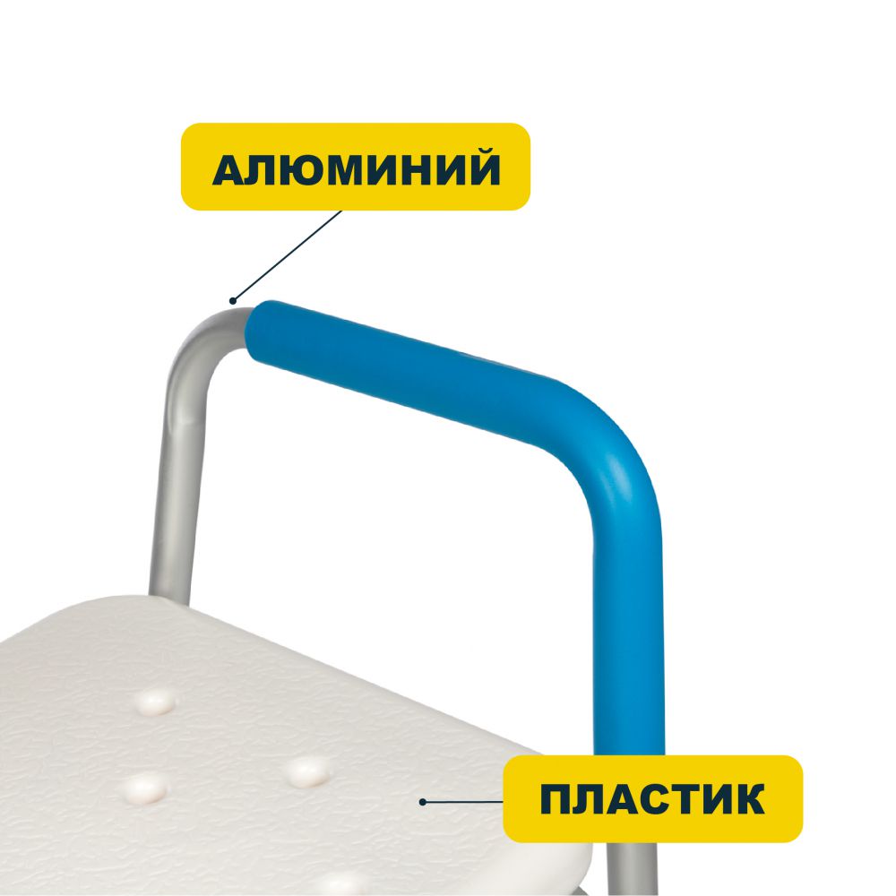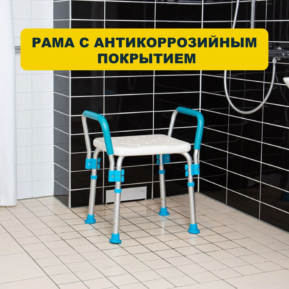 Сидение для ванной и душа облегчает прием гигиенических процедур пенсионерами и людьми с ограниченной подвижностью. Изготовлено из алюминия и качественного пластика, не боится влаги, не ржавеет. Ножки табурета регулируются по высоте, конструкцией предусмотрены съемные подлокотники, за которые можно придерживаться. На поверхности сидения есть отверстия для слива воды, ножки заканчиваются нескользящими накладками. Стул весит почти три килограмма, поэтому некоторым пенсионерам может понадобиться помощь с их установкой в душевую или ванную.