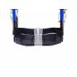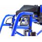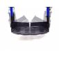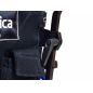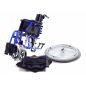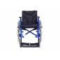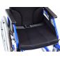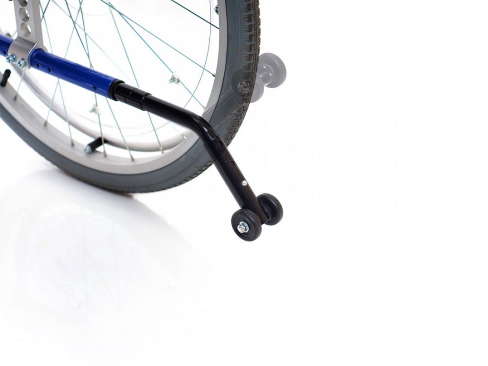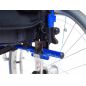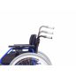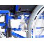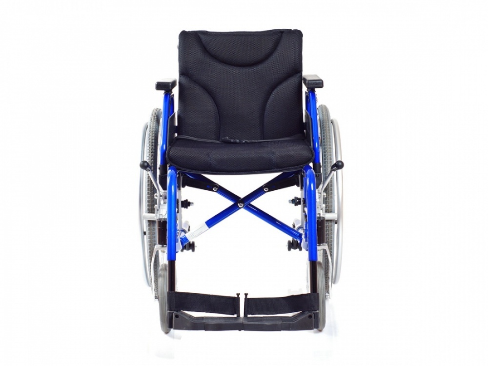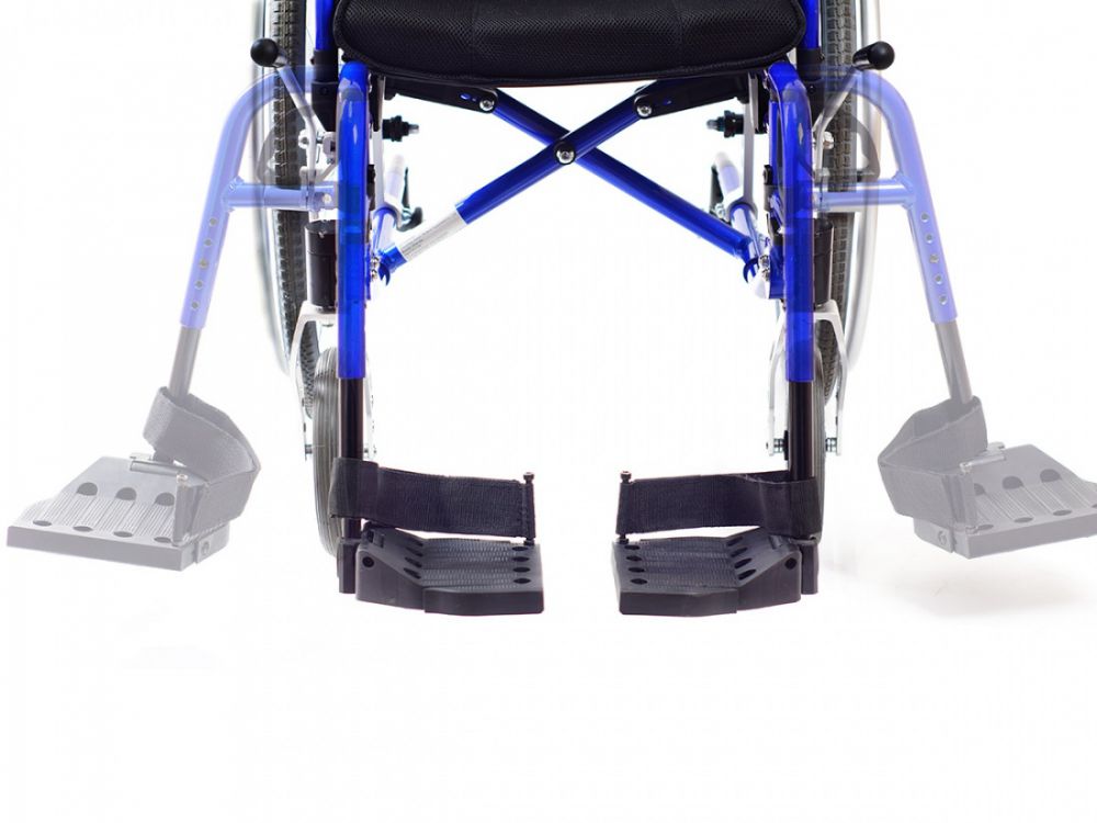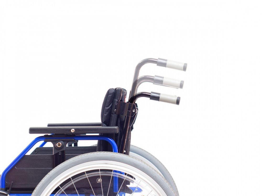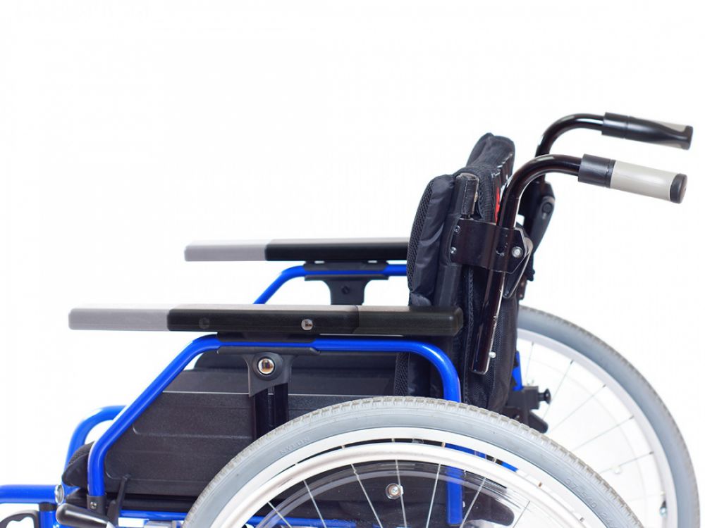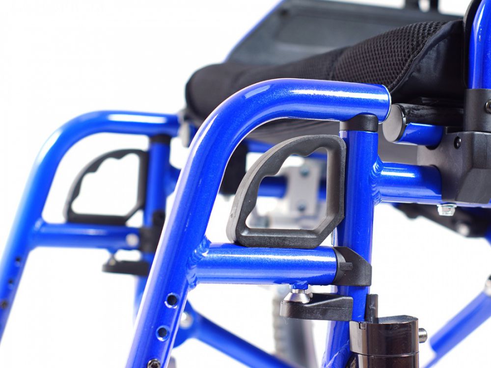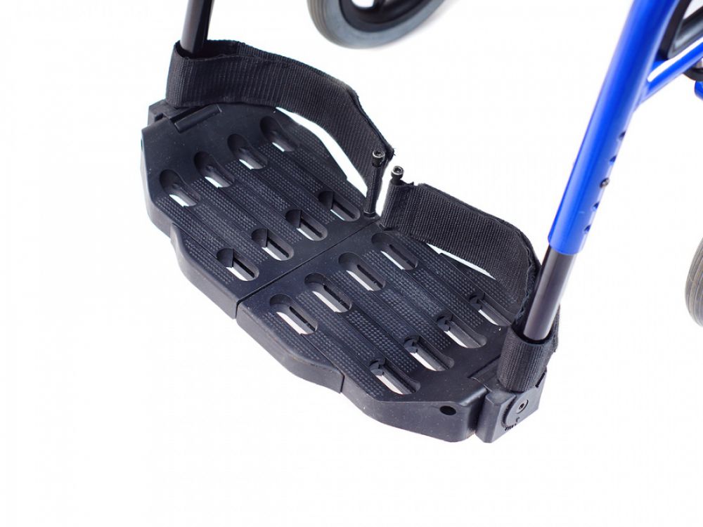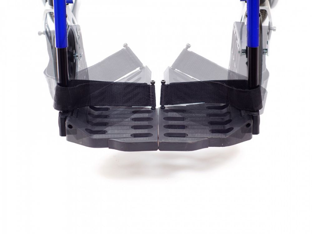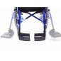 Кресло оборудовано подлокотниками с защитными боковинами, ручками для толкания, откидными подножками с текстильной лентой поддерживающей голени.