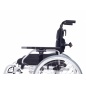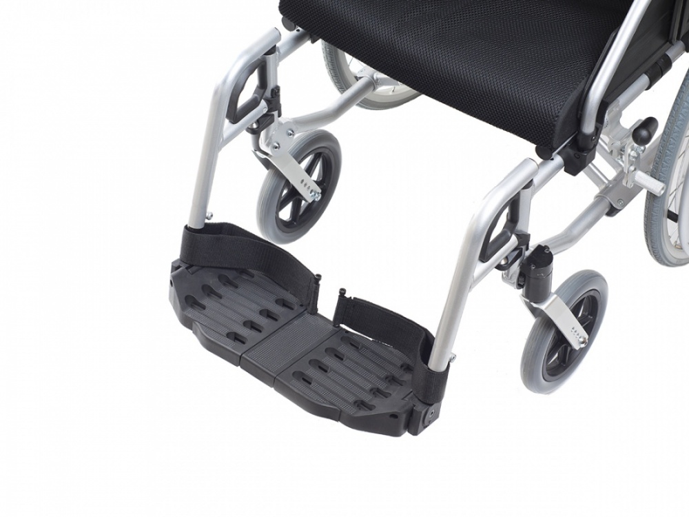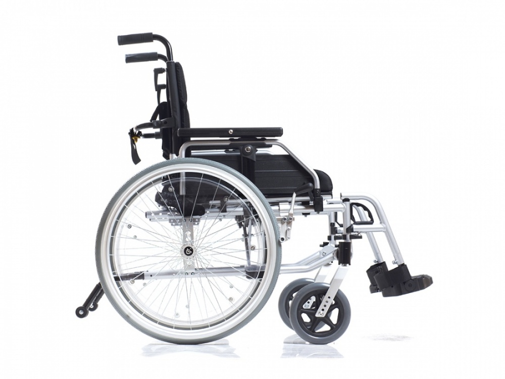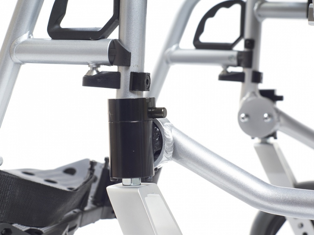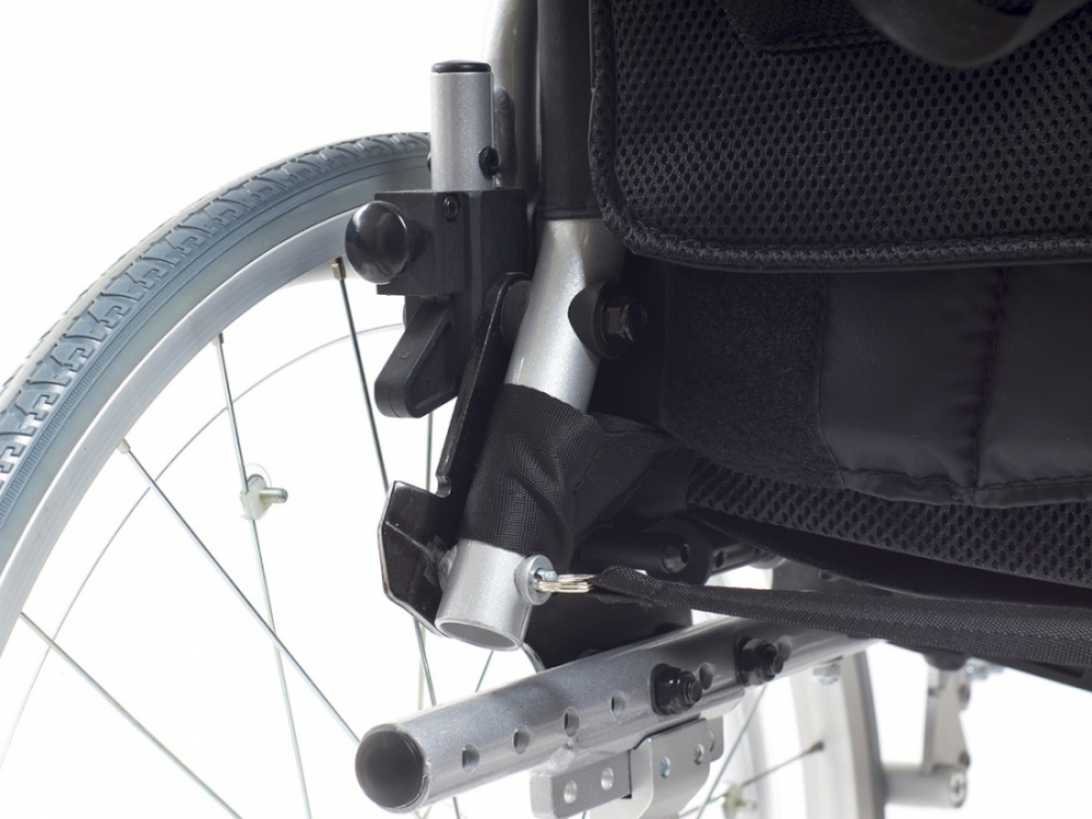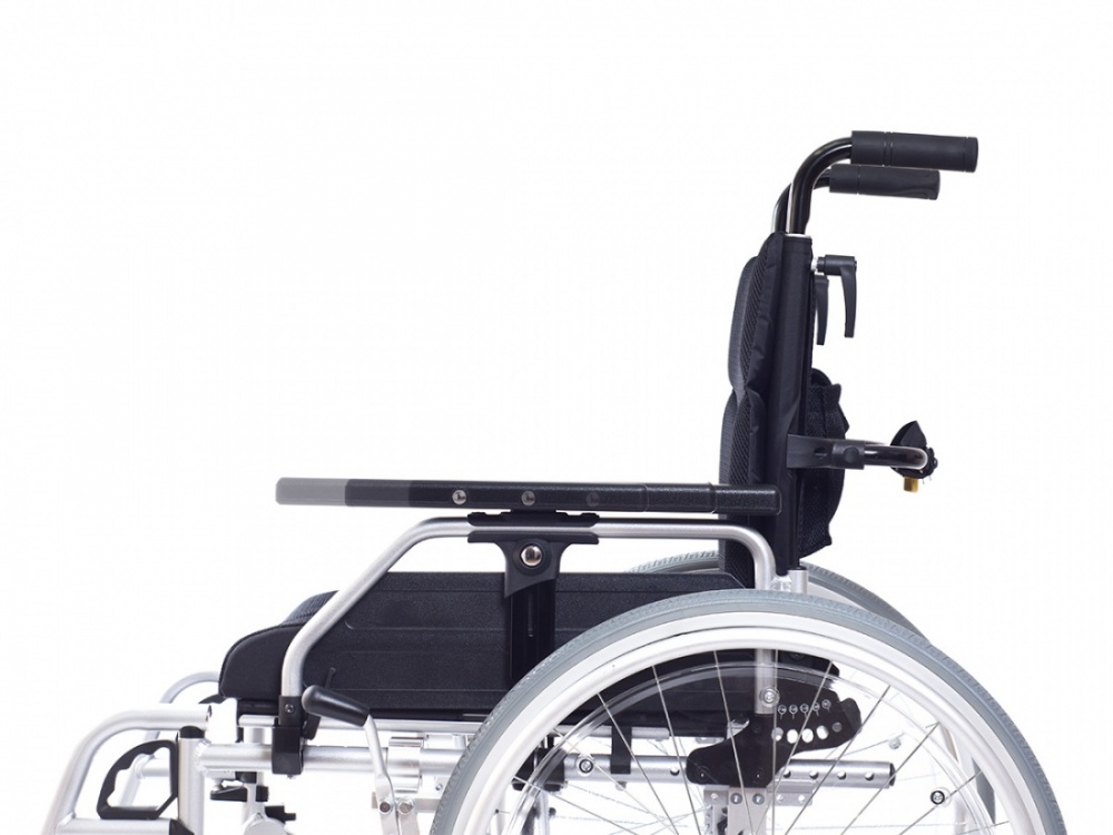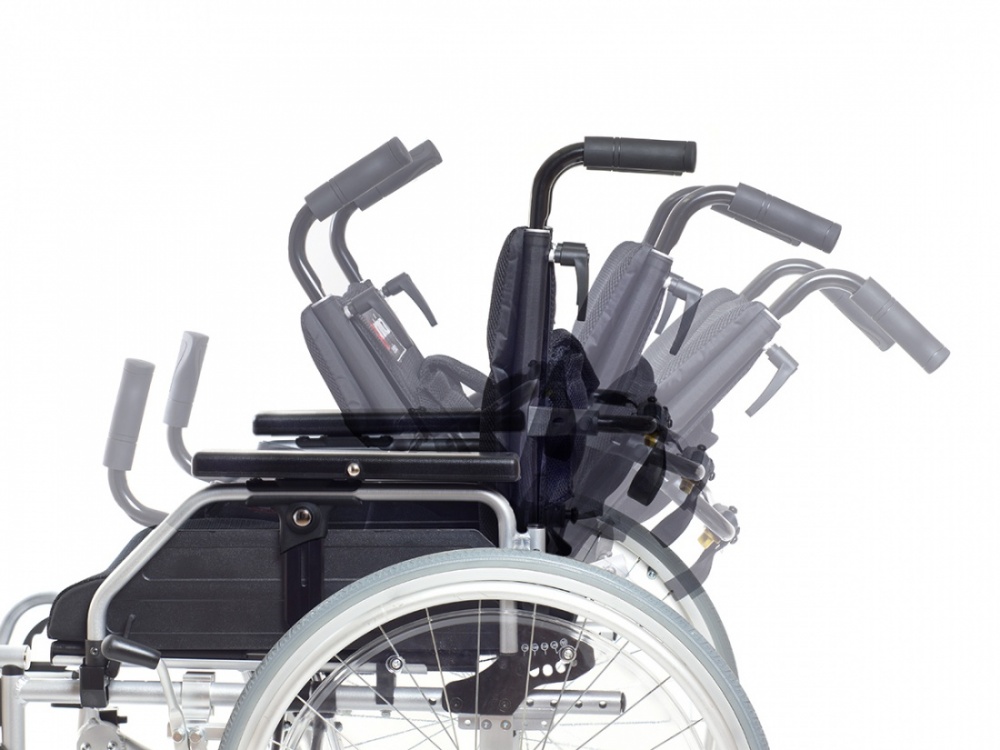 Особенностью модели выстпуает подвижная откидная спинка, регулируемая механическими фиксаторами. Кресло оснащено откидными опорами для рук, подножками, оборудованными текстильной лентой, откидными опорами для стоп.