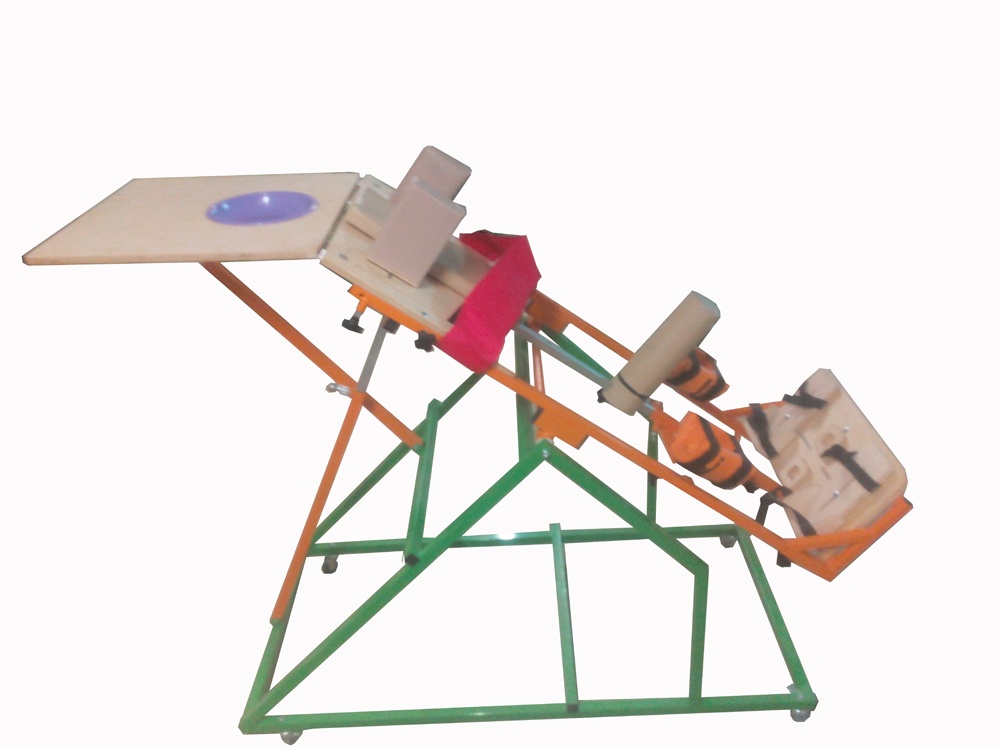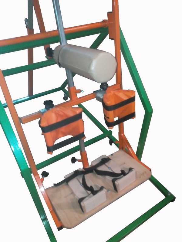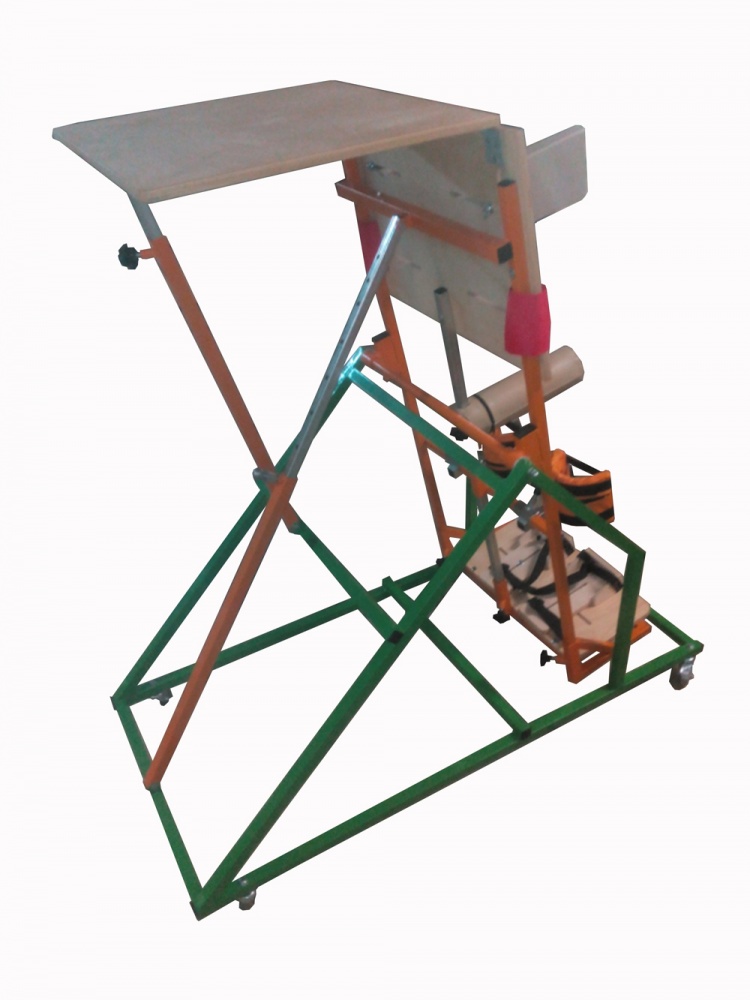 Опора для стояния предназначена для пассивных реабилитационных мероприятий, направленных на адаптацию пациента к вертикальному положению, формирование чувства равновесия, адаптацию кровеносной системы и внутренних органов к новым нагрузкам в условиях вертикального положения тела. Применяется при ДЦП и других патологических состояниях, когда ребенок-инвалид не имеет возможности стоять самостоятельно. Представляет собой наклонный вертикализатор на металлической колесной раме, для вертикально стояния и нахождения в наклонном положении детей с ограниченными возможностями. Комплектуется столиком для приема пищи и занятий. Новая модификация опоры позволяет проводить вертикализацию из полностью горизонтального в вертикальное положение с закреплением в любом промежуточном положении.