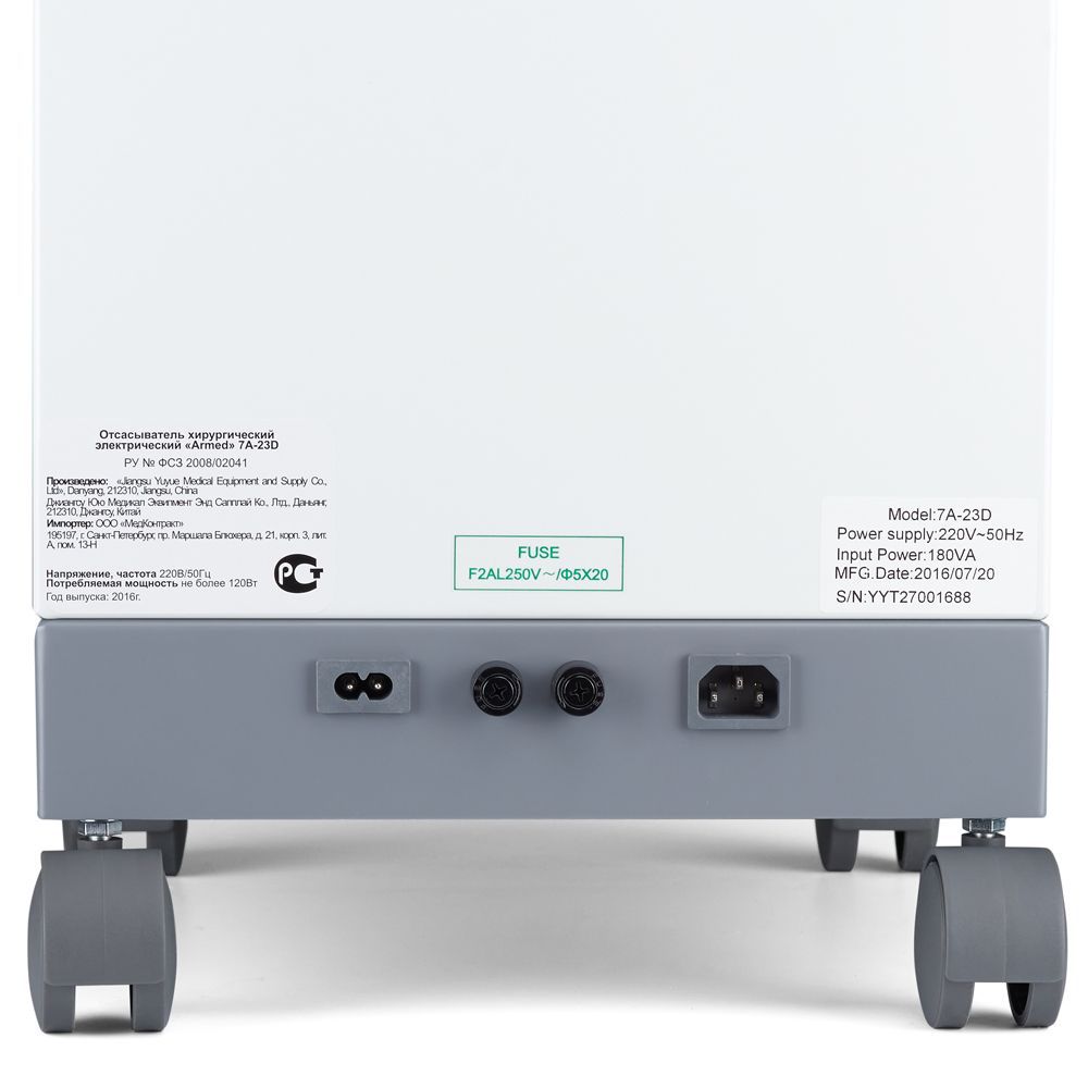 Отсасыватель Armed 7А-23D предназначен для устранения избытка жидкости во время проведения операций и других медицинских процедур. Прибор снабжен двумя банками по 2500 мл. каждая, наконечником для отсасывания, соединительными трубками и шнуром питания. Выключается при помощи педали. Механическая защита предупреждает переполнение резервуаров. Безопасность обеспечивается антибактериальными фильтрами. Отсасыватель бесшумен и прост в использовании. Прибор можно перемещать при помощи колес и удобной ручки.
