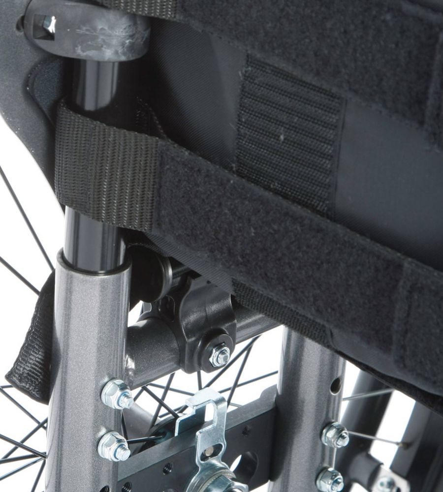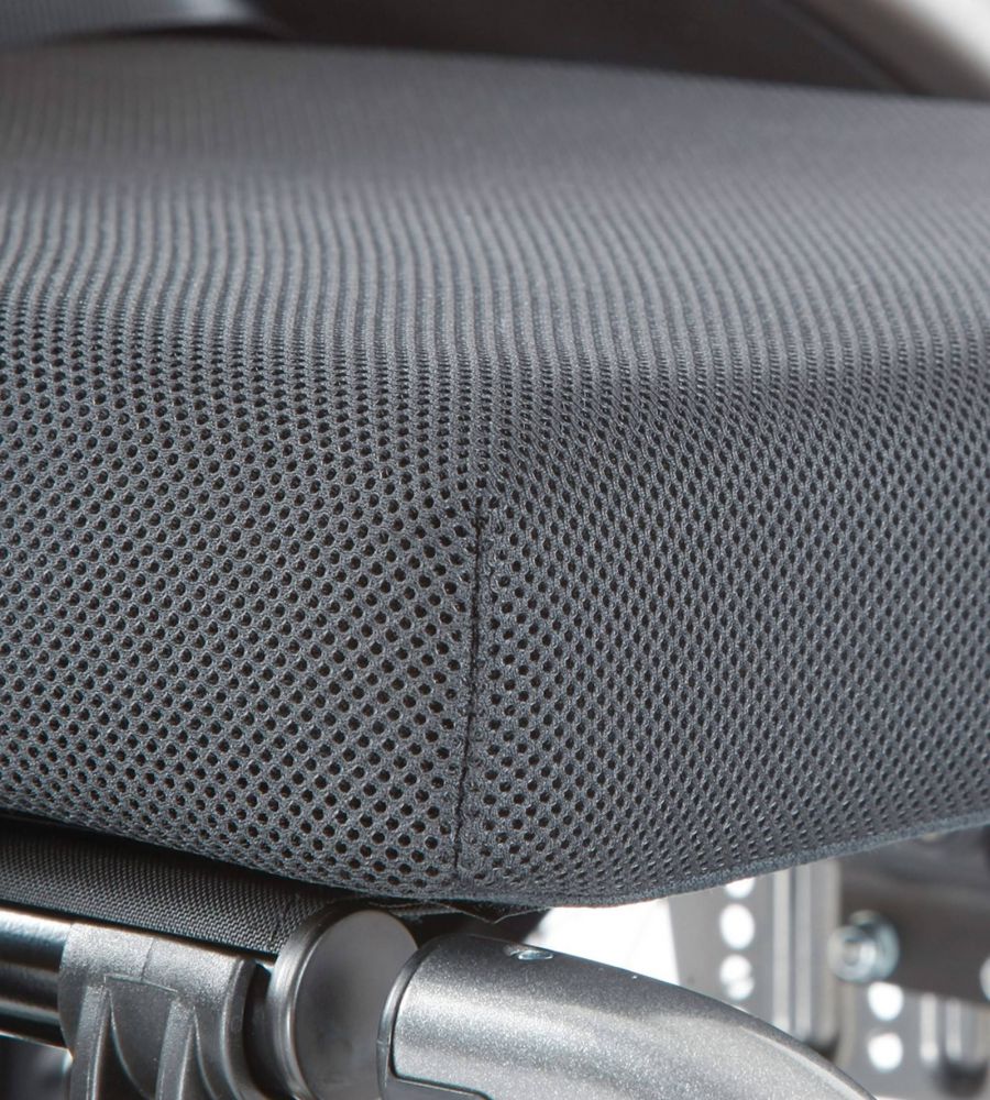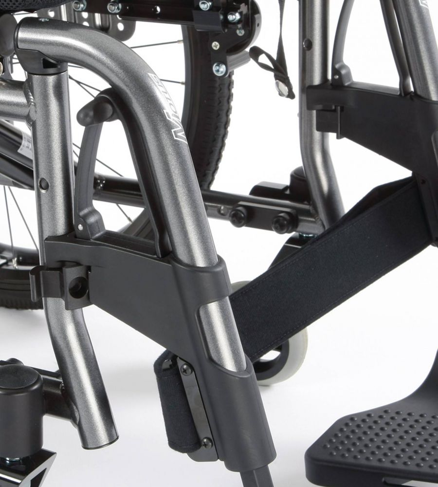 Мотус CV оснащен откидывающимися, съемными подножками с регулируемым углом наклона опор для стоп. Точная настройка центра тяжести кресла-коляски обеспечивает ее мобильность и устойчивость. Эргономичная спинка с регулировкой натяжения создает для пользователя комфорт и продлевает срок службы спинки. Обшивка выполнена из дышащего материала.