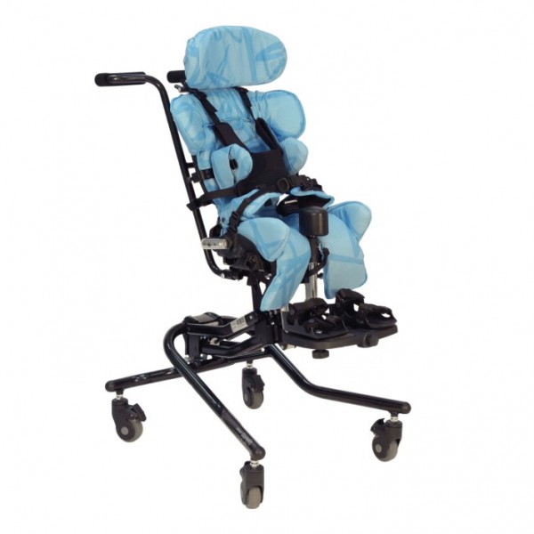 Подстройка зависит от задач реабилитации и уровня физического развития ребенка. Широкая опорная рама оснащена колесами, каждое из которых имеет индивидуальный тормоз. Подножки имеют крепежные ремни для надежной фиксации стопы.