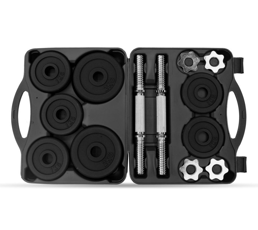Наборные гантели Oxygen Fitness DB-SET20 для фитнес-тренировок. Комплект позволяет собрать две гантели с различными весами от 5 до 10 кг. Максимальный наборный вес одной гантели при использовании блинов из комплекта – 14 кг.