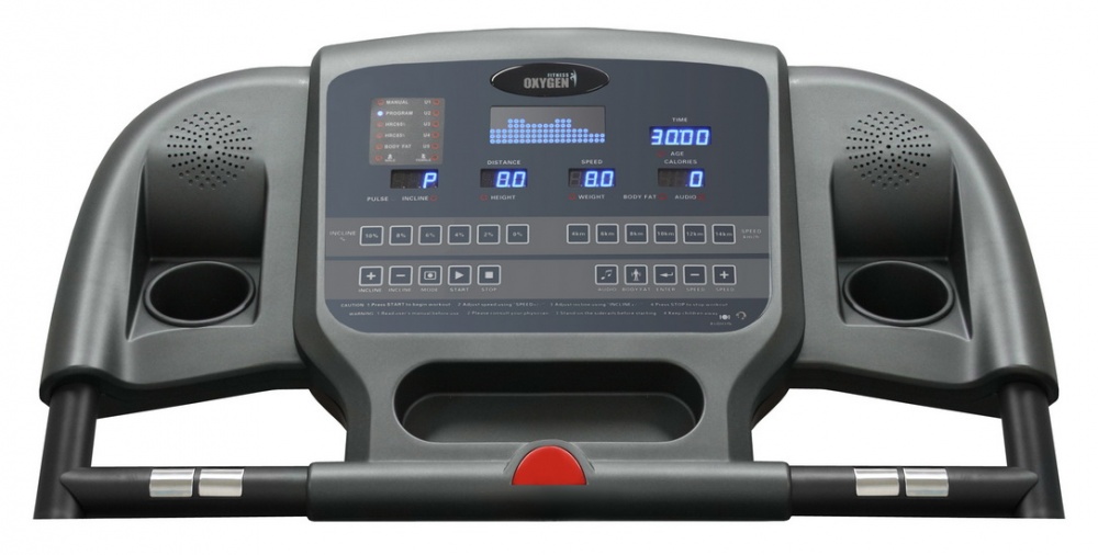 Консоль дорожки оснащена большим многофункциональным 6-ти оконным LED дисплеем c голубыми светодиодами повышенной контрастности, но экран которого выводятся все основные параметры, включая профиль тренировки. В программный пакет включены 28 тренировочных режимов, а также 5 пользовательских и 2 пульсозависимые программы. Мультимедийная компонента представлена динамиками 5 Ватт, входами USB и Audio IN для проигрывания музыки с MP3-плеера либо USB накопителя.