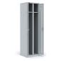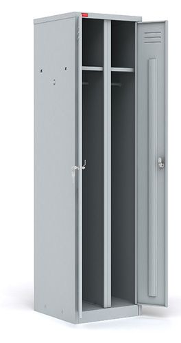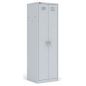 Шкаф металлический разборный двухсекционный, предназначен для хранения сменной одежды. В стандартную комплектацию каждой секции входят съемная полка для головного убора, перекладина для вешалки и крючки для одежды, врезной замок. Шкаф может комплектоваться полками для обуви и регулируемыми опорами (в комплект не входят). Полимерное порошковое покрытие светло-серого цвета (RAL 7035).