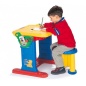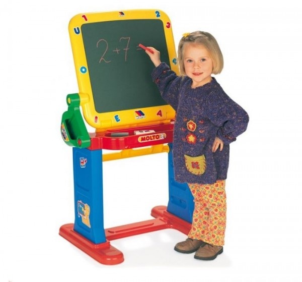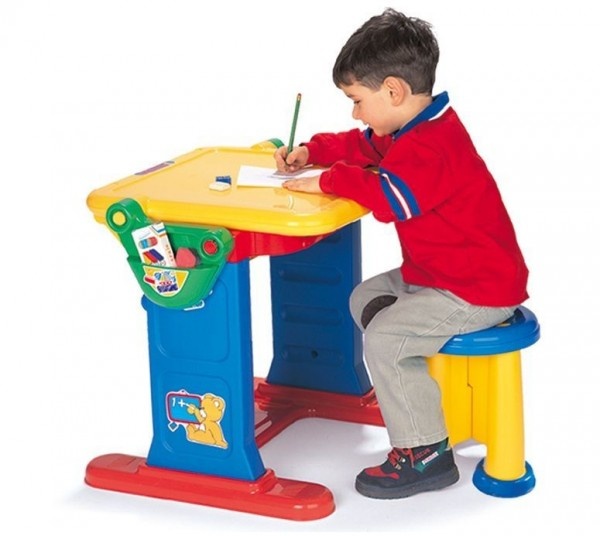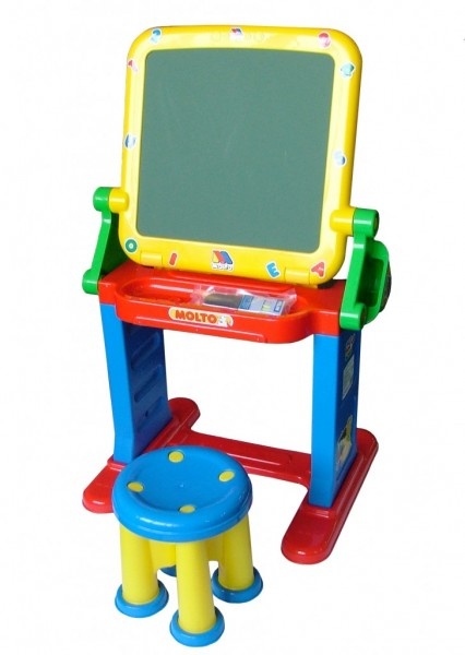 В комплекте набора есть все для организации небольшой детской художественной студии. Доска для рисования легко превращается в парту, для этого нужно всего лишь опустить ее вниз и закрепить. У самой доски внизу и по двум сторонам располагаются специальные поддоны для кисточек, мелков, карандашей, для губки и других аксессуаров. Очень удобно то, что ребенок может выбирать способ рисования, на доске или на бумаге. Такой набор незаменим для малогабаритных квартир, где не умещаются сразу несколько предметов мебели. В комплекте есть яркий прочный табурет, который идеально подходит по высоте к парте-доске.