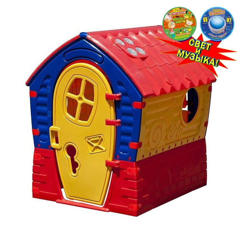 Домик для игр Лилипут 681 идет с дополнительным аксессуаром фонариком со светом и музыкой. Спереди имеется дверца для входа, а в трех остальных стенках предусмотрено по окошку, одно из которых имеет ставни. Окошко на крыше имеет имитацию стекол из полупрозрачного пластика.