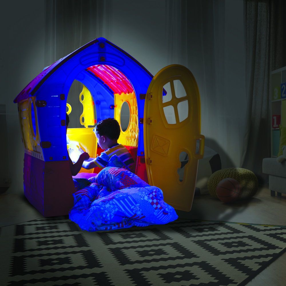 Вместительный игровой домик, выполненный в ярких расцветках. Его можно использовать для одиночных и коллективных игр детей, устанавливать как на улице, так и внутри помещения.