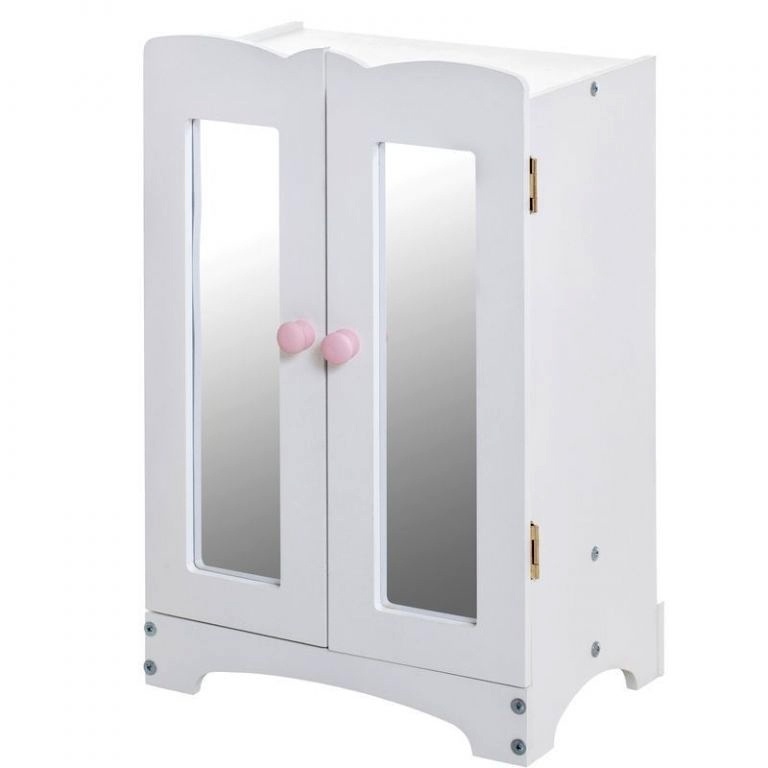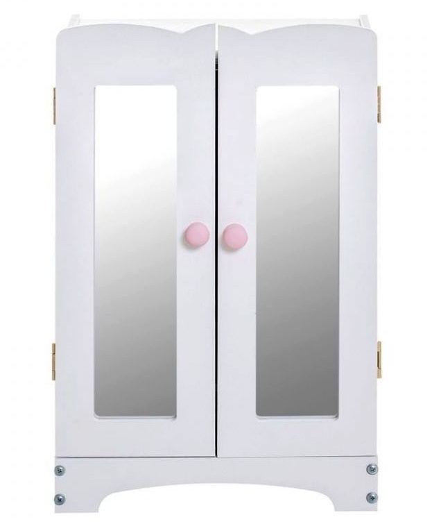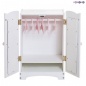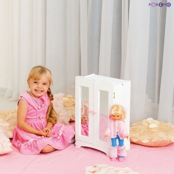 Кукольный шкаф выполнен в классическом стиле. Белый цвет будет гармонично сочетаться с другими предметами интерьера в детской комнате ребенка. Внутри шкафа имеется туба, на которой весят несколько тремпелей, внизу расположена полка открытого типа. Мебель достаточно вместительна, что дает возможность ребенку разместить в ней все вещи и обувь для своих кукол.
