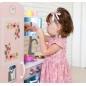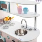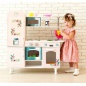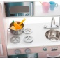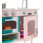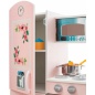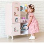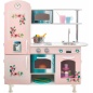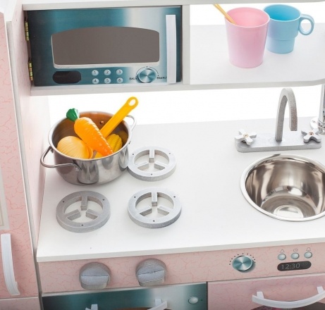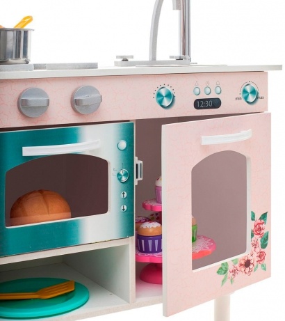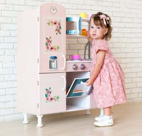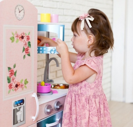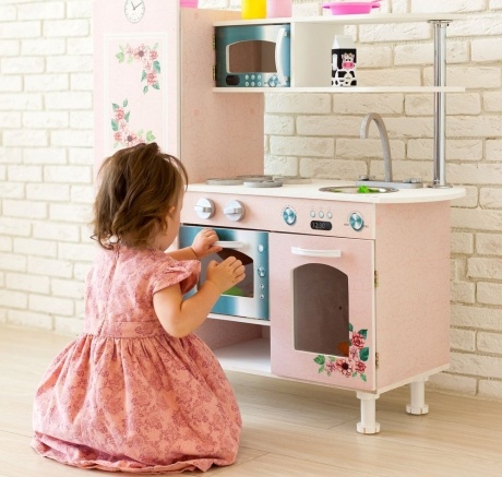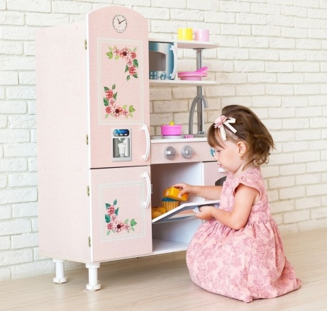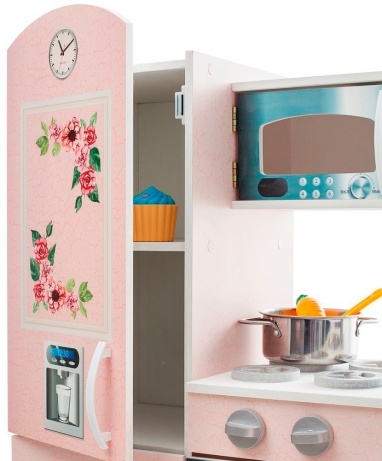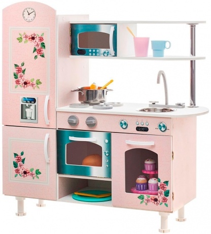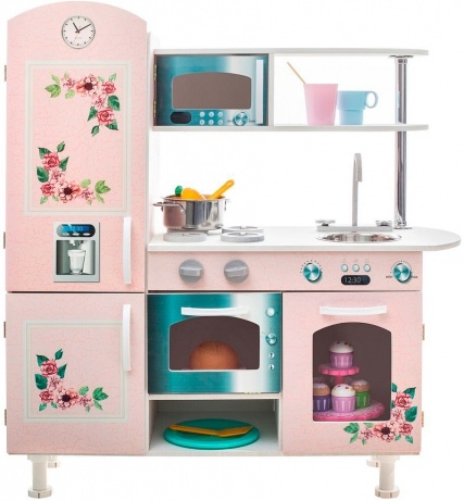 Эта кухня очарует любую девочку, ведь на ее фасадах размещены такие красивые наклейки с изящными цветочками. Но еще больше малышкам понравится представлять себя хозяюшкой, готовящей для близких вкусные угощения на плите или в духовке, а также моющей посуду в раковине с высоким краном.