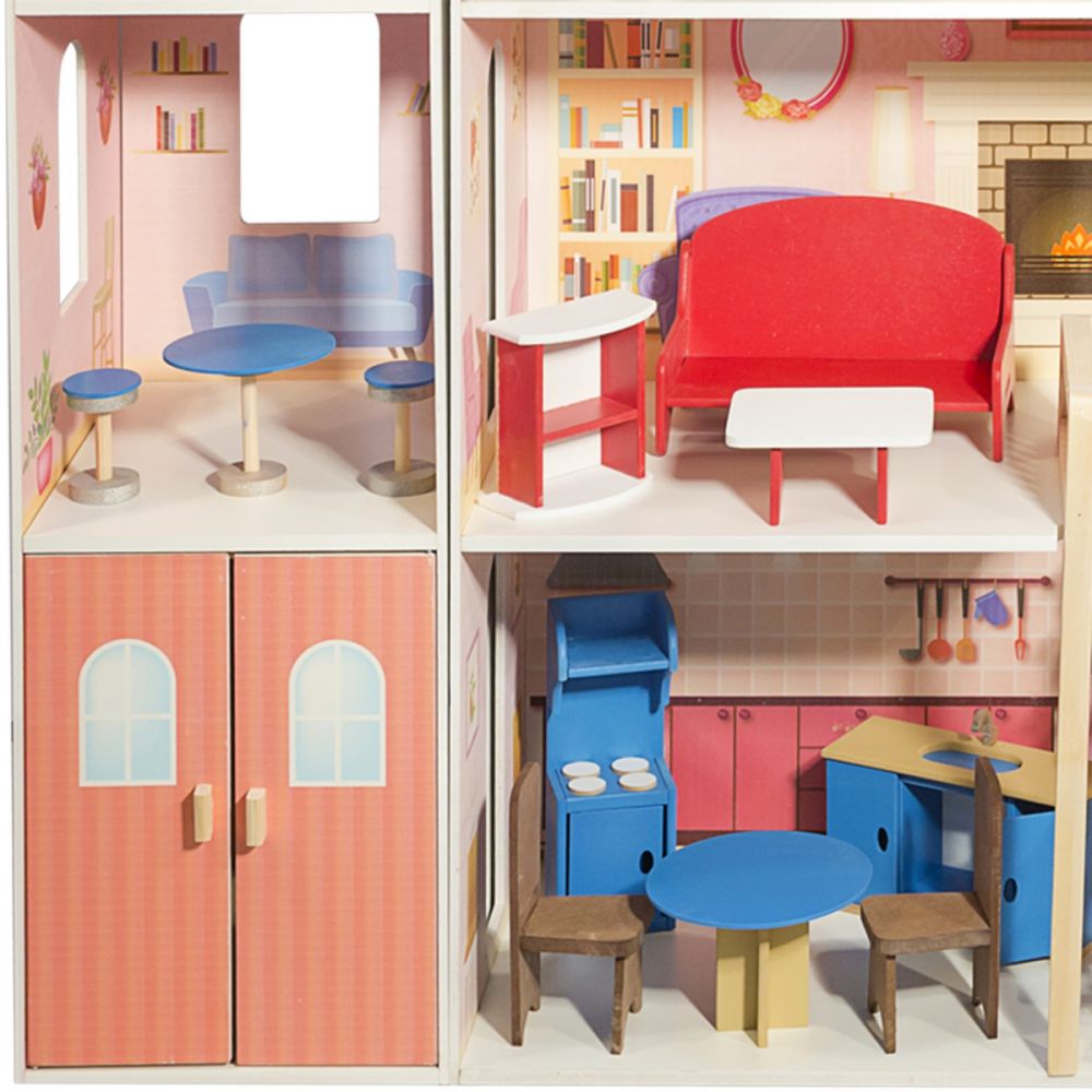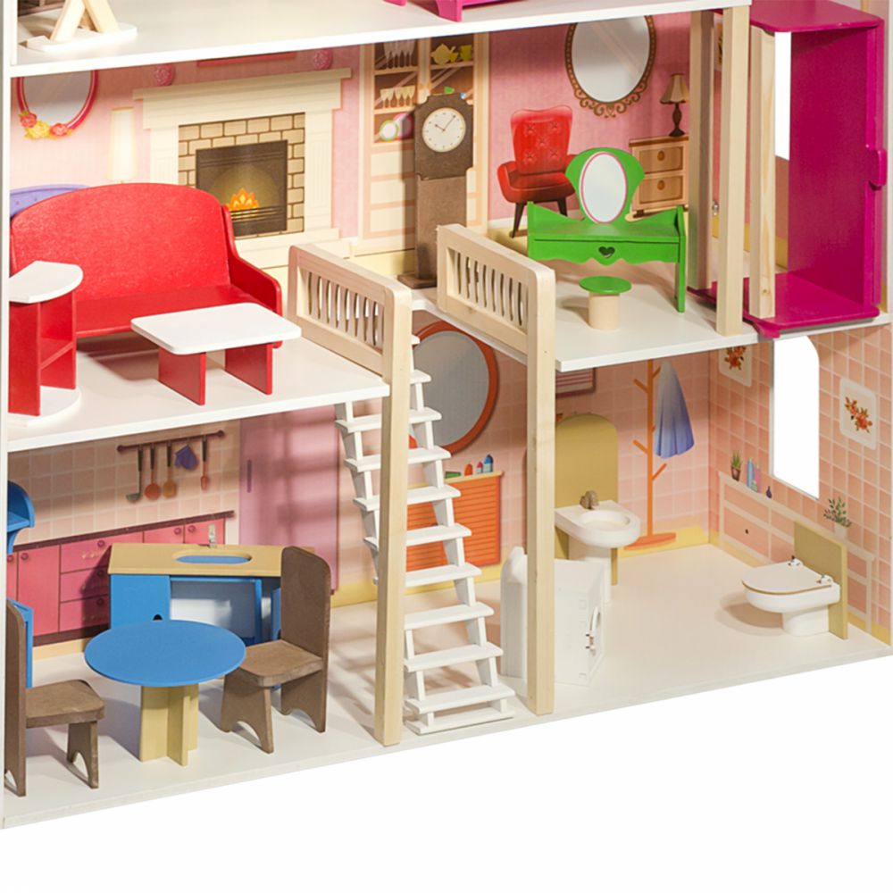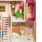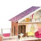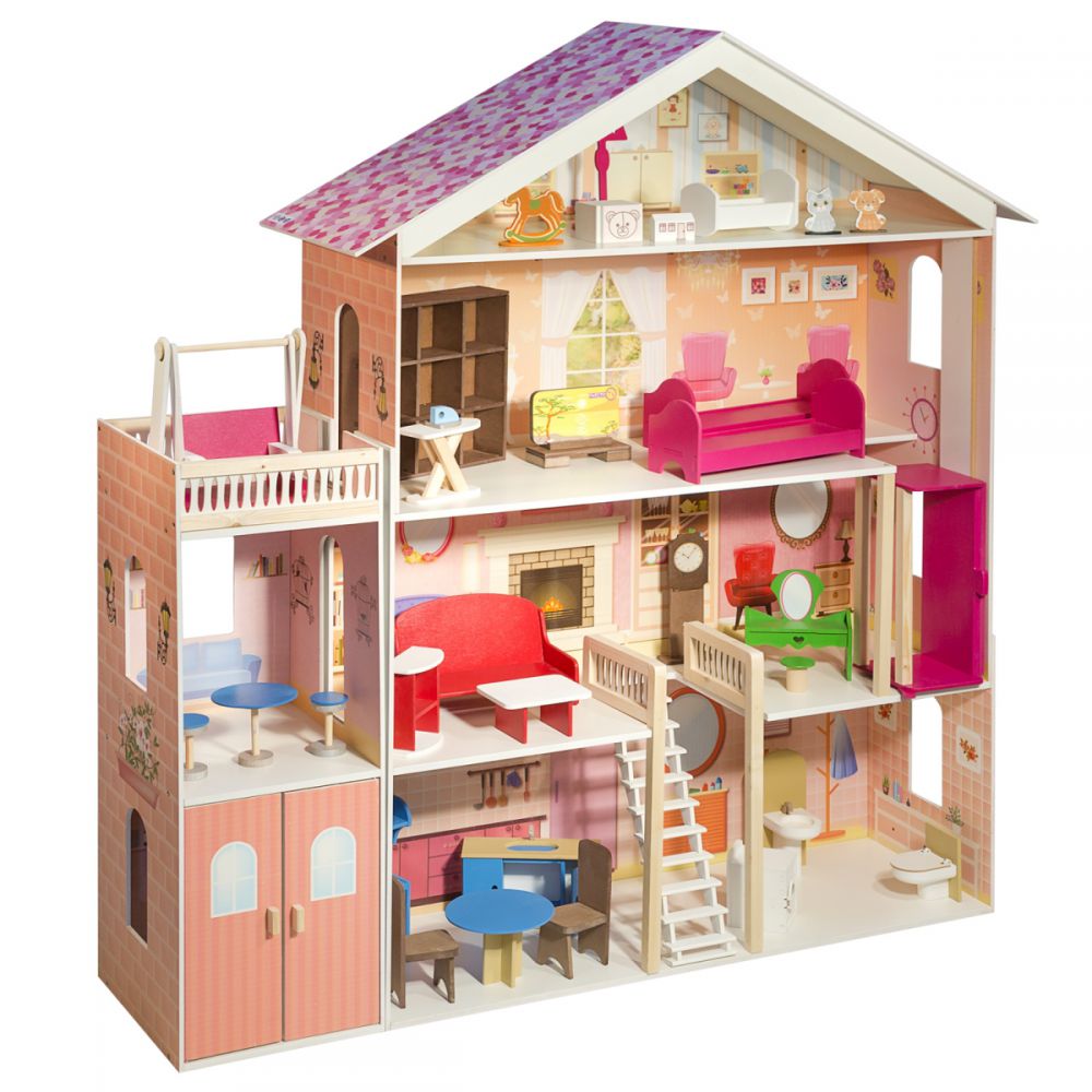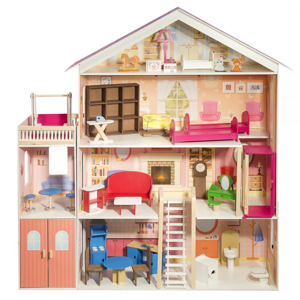Классическое для девичьей игрушки розовое цветовое решение сразу придает домику ауру мечтательности, лаконичный дизайн игрушки смотрится гармонично. В доме 4 этажа, 6 просторных комнат, веранда, большой балкон и гараж для кукольного транспорта.